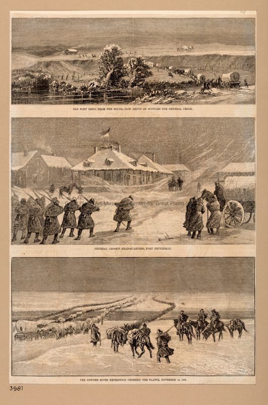 Animals, Mules, Horses, Conflict, Generals, Campaigns, Military, Carts & wagons, Wagon trains, Marching, Guns, Firearms, Weapons, Men, Trees, Winter, Snow, Wind (air movement), Expeditions & surveys, Forts & fortifications, Flags, Buildings, Abandoned buildings, Magazine illustrations, Native peoples