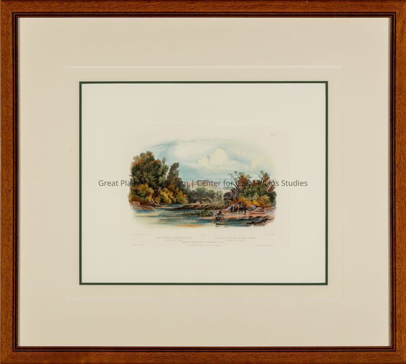 Animals, Burials, Chiefs (Native Americans), Death, Domestic Animals, Fort Atkinson, Nebraska, Horses, Landscapes, Maximilian-Bodmer Expedition, Men, Missouri River, Native Americans, Omaha (Native Americans), Plains (Native Americans), Riding, Rivers, Trees, Water