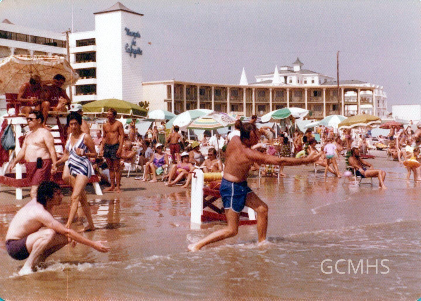 Beachgoers in the early 70's, tide coming in, playing basseball