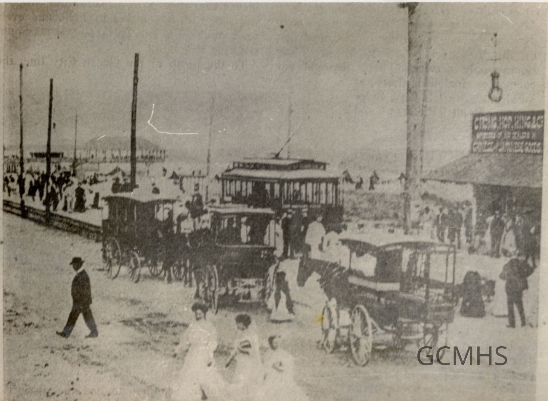 Boardwalk with trolley and horse drawn carriages, n.d.