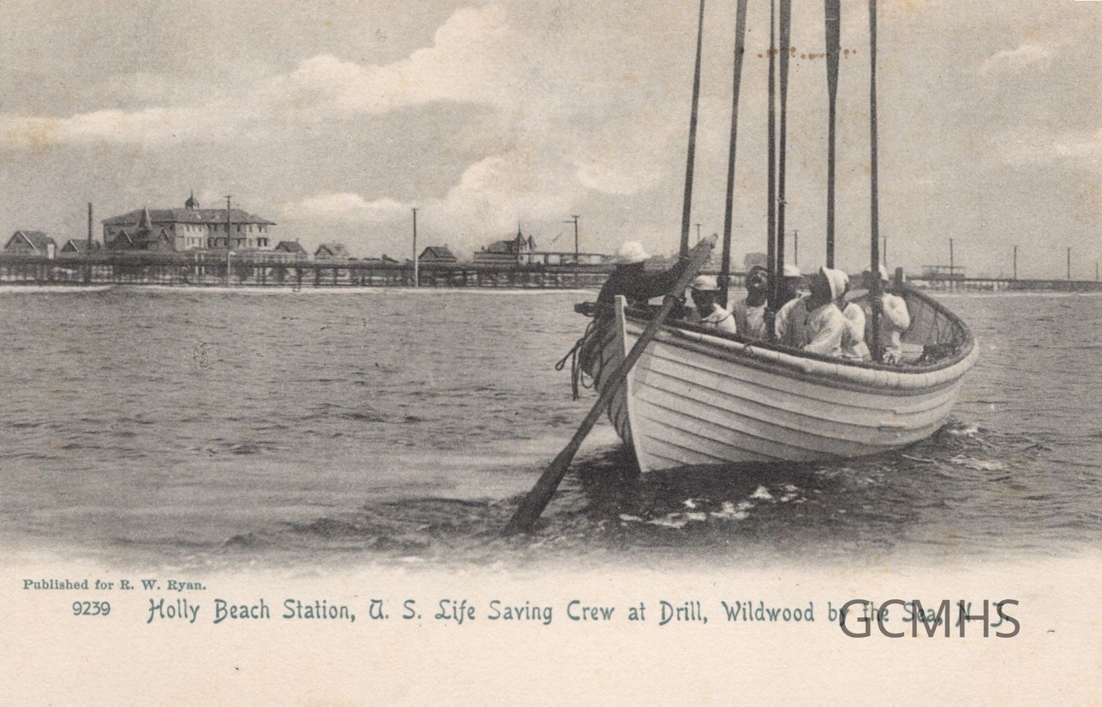 Includes two B&W photo post cards. One, published by the Rotograph Co., NY, depicts Holly Beach Station with the U.S. Lifesaving Crew at Drill in Wildwood. The other, published by Willets Carson, depicts Benny's Landing in Cape May Court House.Collection