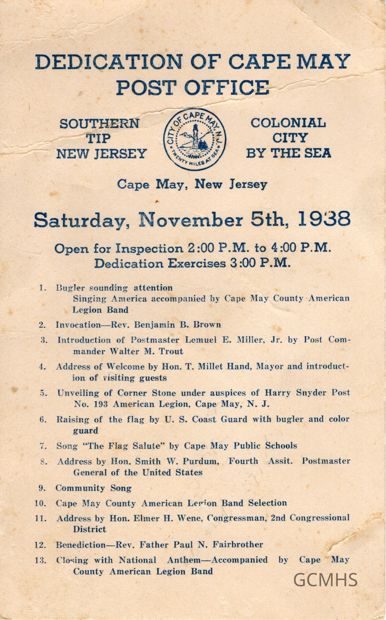 Includes a program for the dedication of the Cape May Post Office on November 5, 1938.