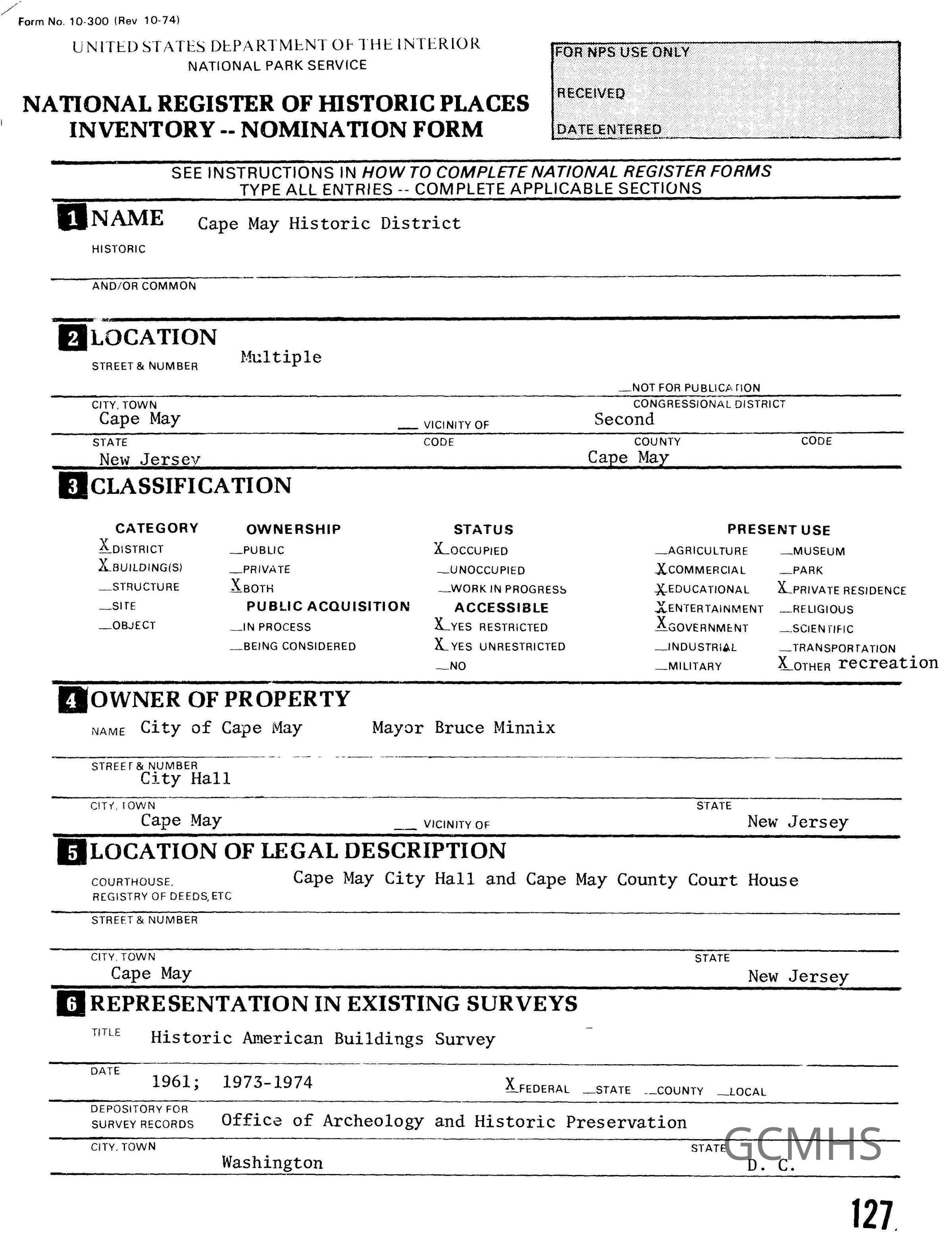 The document submitted by Carolyn Pitts resulting in Cape May receiving the National Historic Landmark Designation.Context