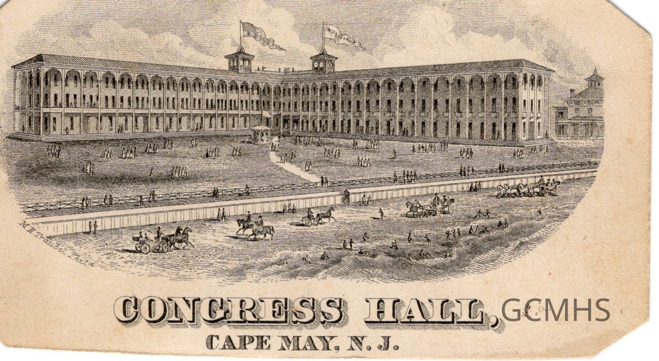 Includes one business card with an engraving of Congress Hall and horse and buggies on the beach. The verso claims that the hotel sits at the "highest point of land in Cape May with the finest lawn on the Atlantic Coast" and rooms at high season for $4.00 a day.Collection