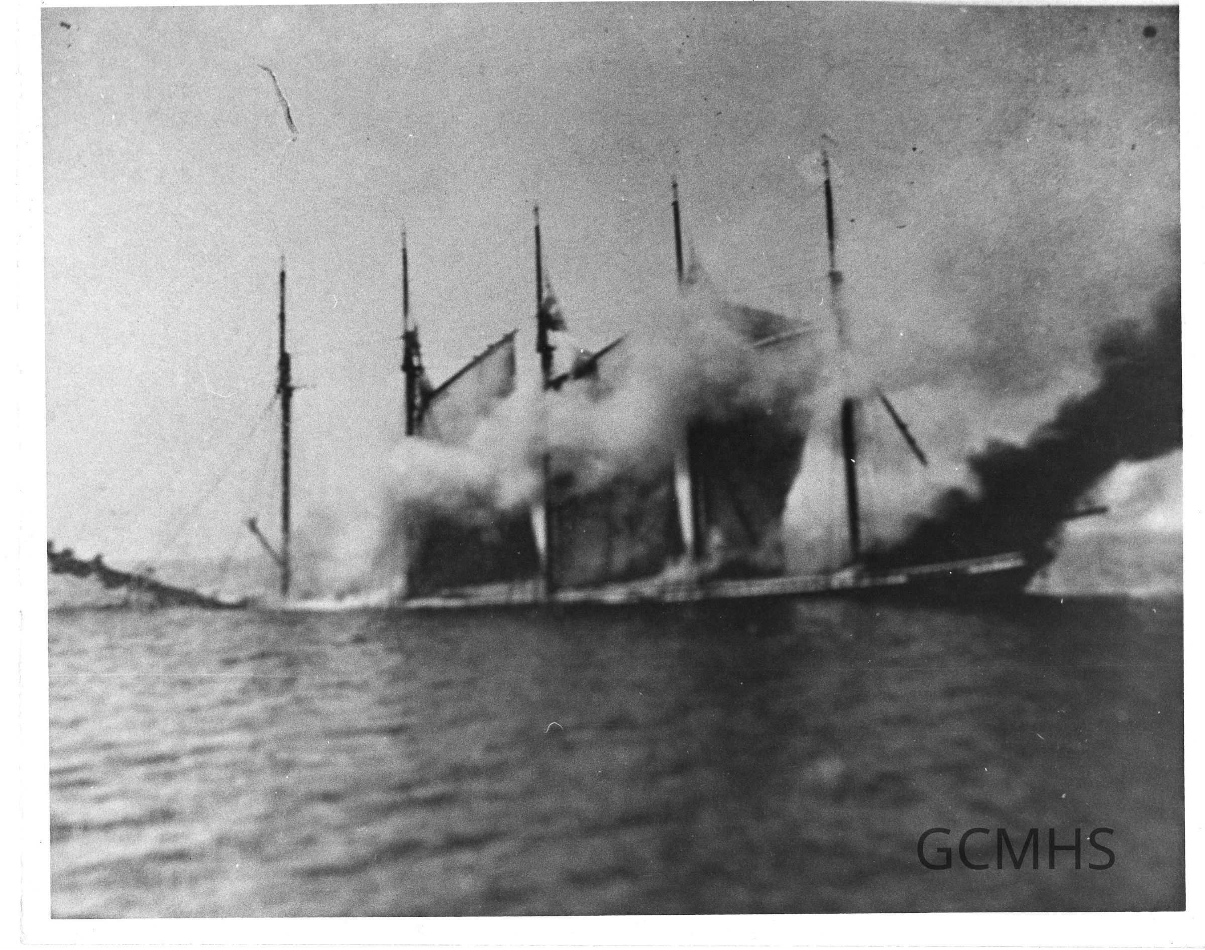Includes one 8" x 10" copy print depicting a five masted schooner engulfed in heavy smoke. This may be the Paul Palmer that caught fire and sank in Massachusetts Bay.Collection
