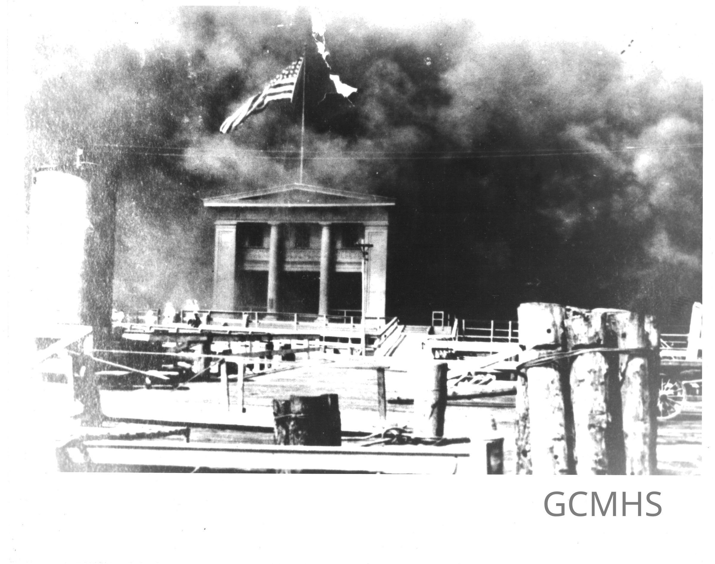 Includes two 8" x 10" copy prints, one depicting a building engulfed in smoke, and the other the burnt structure on the beach.