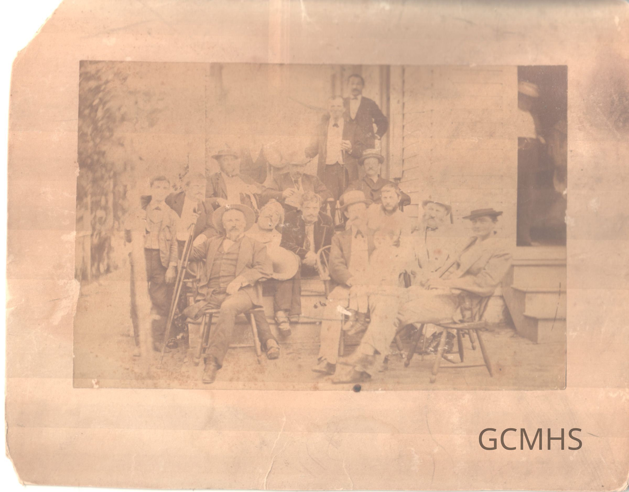 Group of men and boys seated on a porch, n.d.