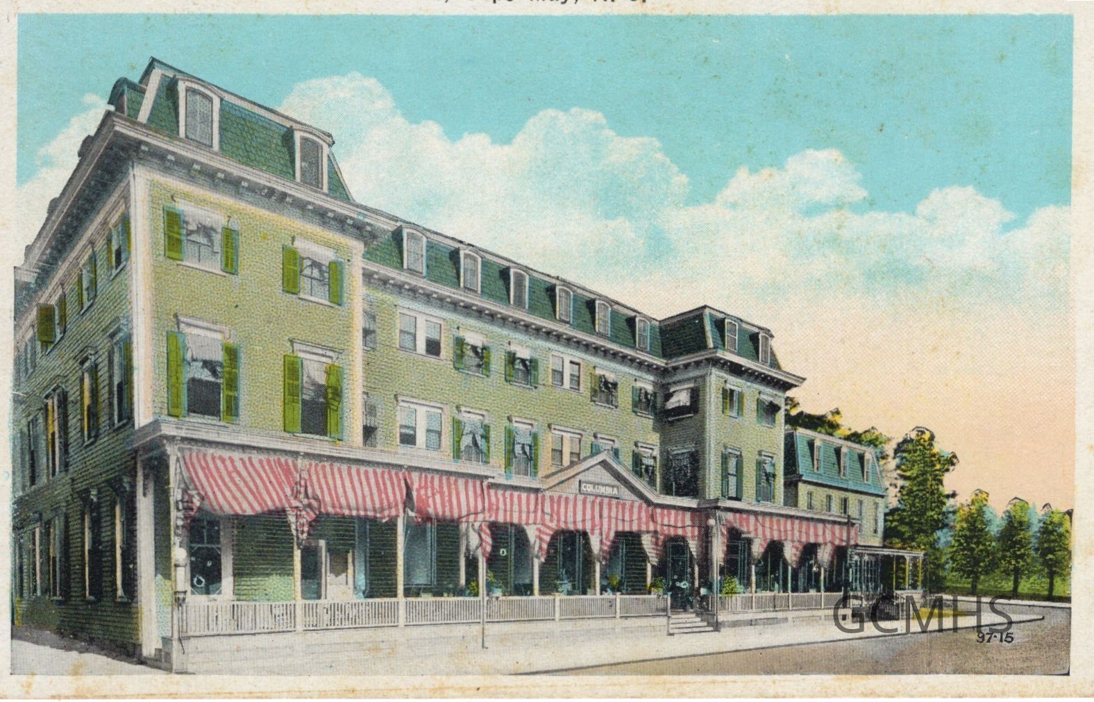 Includes six colorized B&W photo post cards and one B&W photo post card depicting Cape May hotels: the Columbia Hotel (two cards, two views), one published by W. F. Ruepsch ; the Stockton Hotel, published by Postal Card Co., NY ; the Admiral Hotel from the pool (colorized), published by D.J. Ricker, Cape May ; the Admiral Hotel from the beach (B&W), published by Read-Taylor, Baltimore ; Columbia House ; and Centre House.Collection