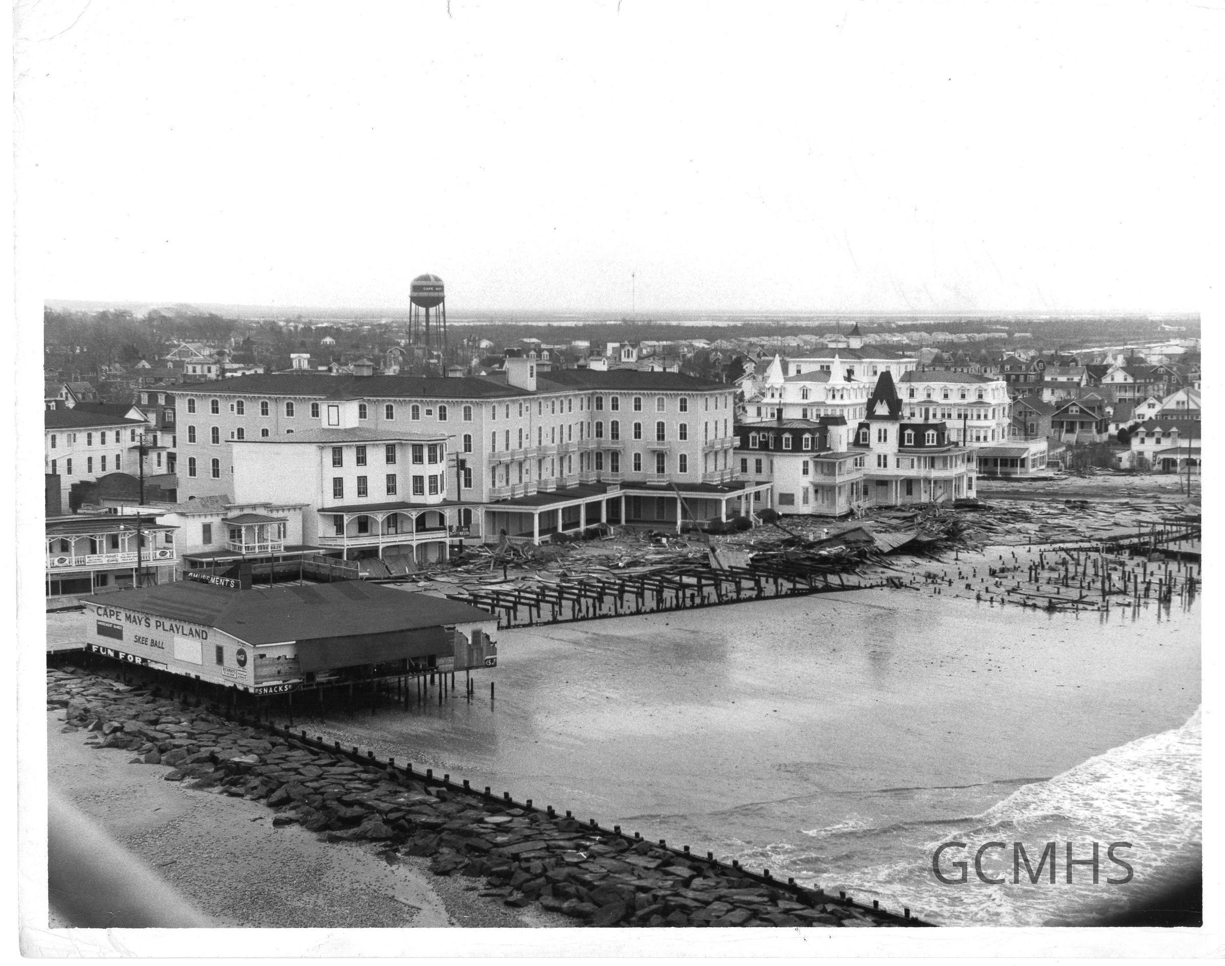 Includes one 8" x 10" copy print depicting the aftermath of the Ash Wednesday Storm where every business on Beach Avenue suffered damage. Verso is labeled: "1962" and "Pilings at right are where stores were"Collection