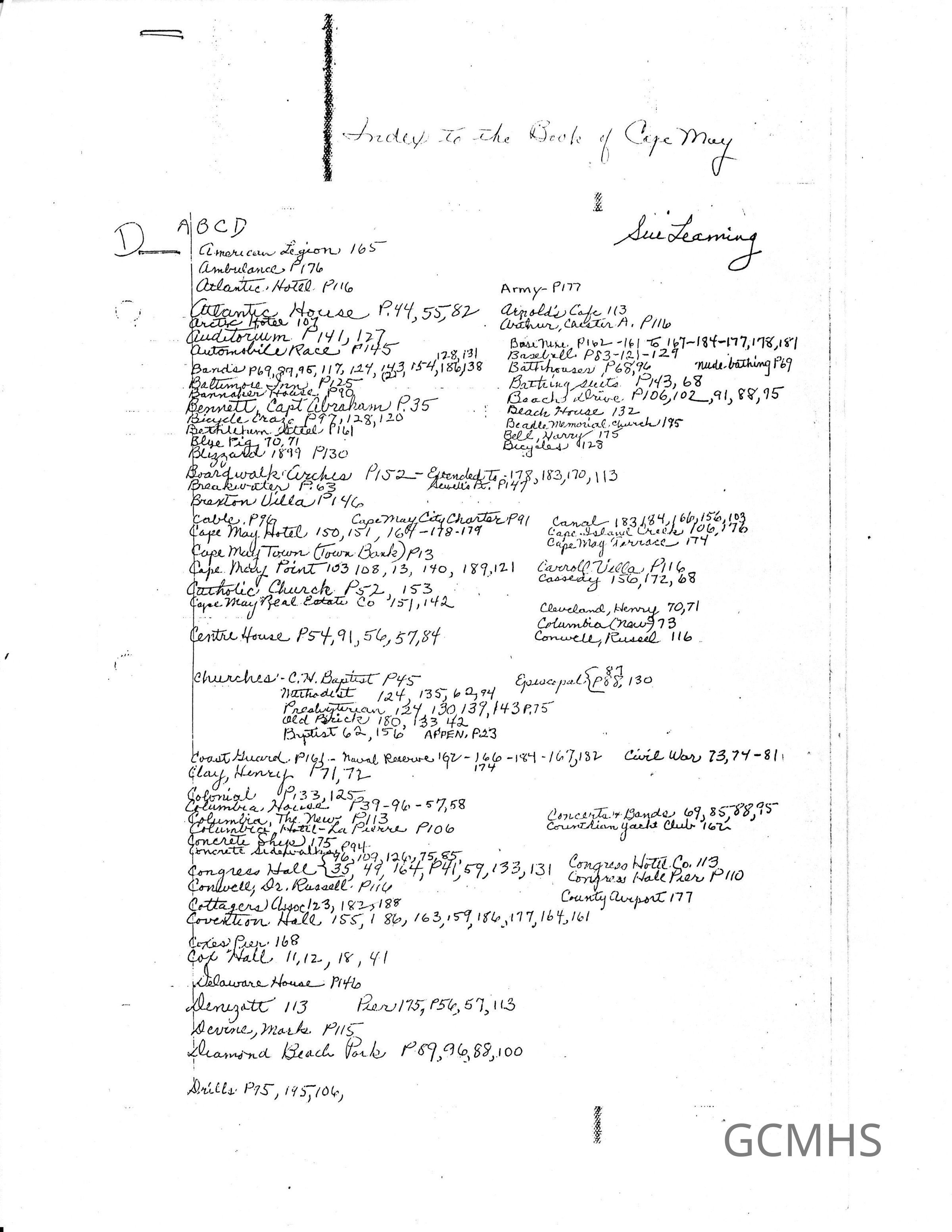 Handwritten index for the Book of Cape May by Sue Leaming.