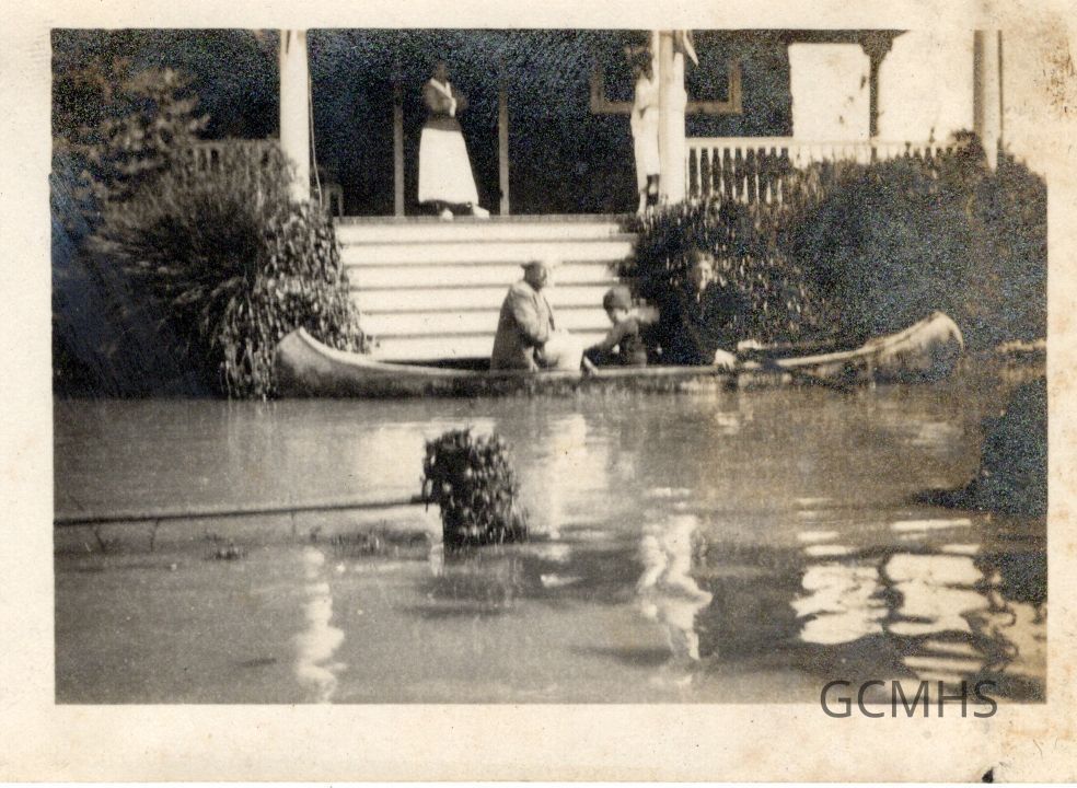 Includes three small B&W photos of the Ogden home at 815 Kearney Ave. with flood waters surrounding it, people in a canoe floating by the front steps, and two girls standing in the flood water and carrying two babies. Verso of one: Probably taken from Eldridge Porch—In AGO scrap book—along with others in the early 1920s/late teens.Collection