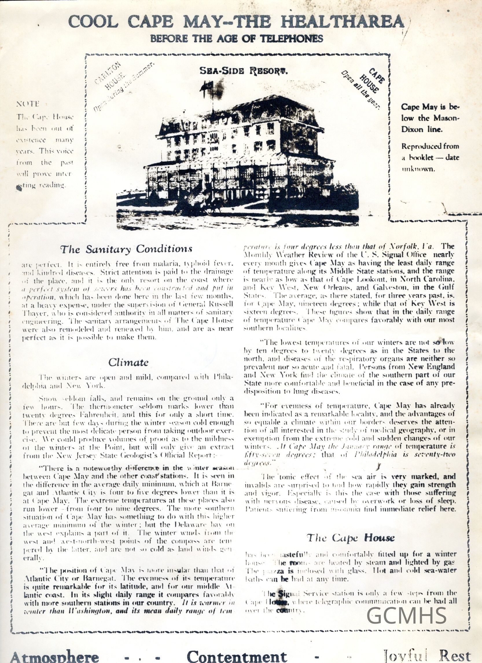 Includes a photo stat, negative and positive, copied from a booklet advertising "Cool Cape May—The Healtherea," the Carleton House, only open in summer, and the Cape House, open all year, and extolling health benefits of Cape May.Collection