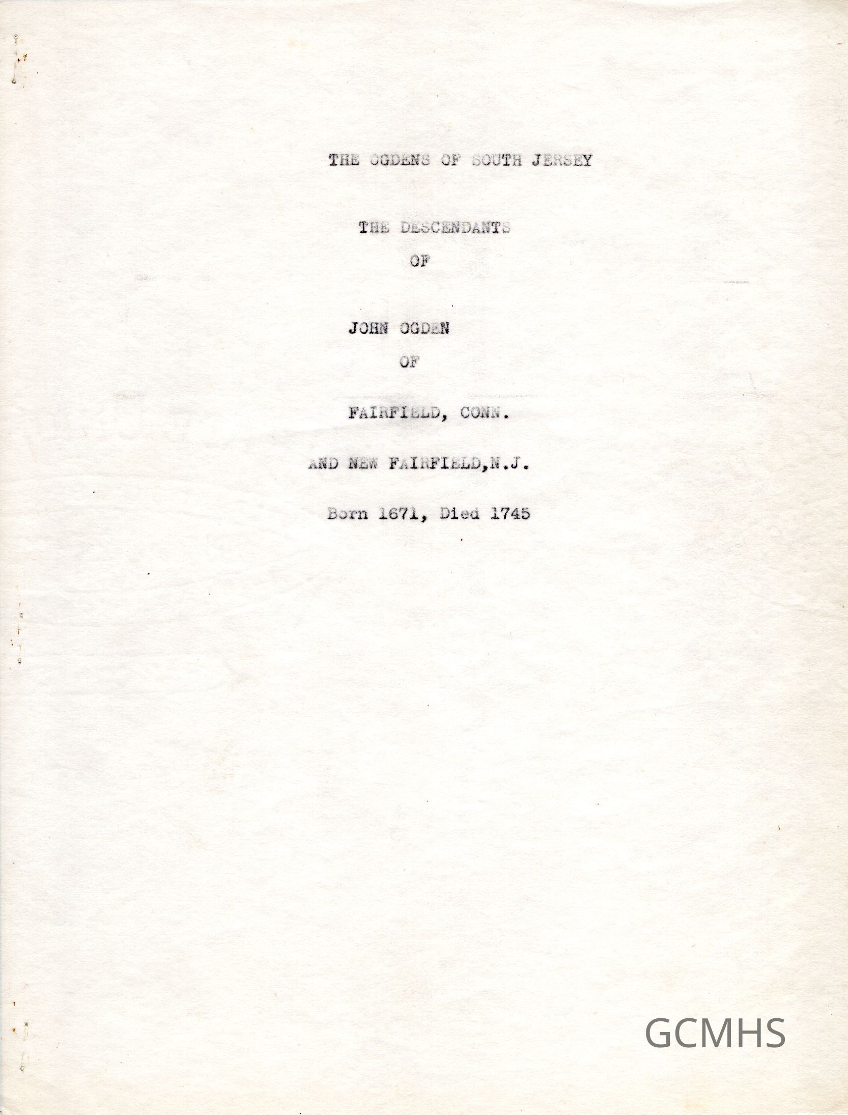 Includes a thirteen page genealogy of the Ogden family beginning with "John Ogden of Fairfield, Conn. and New Fairfield, N.J. Born 1671, Died 1745."
