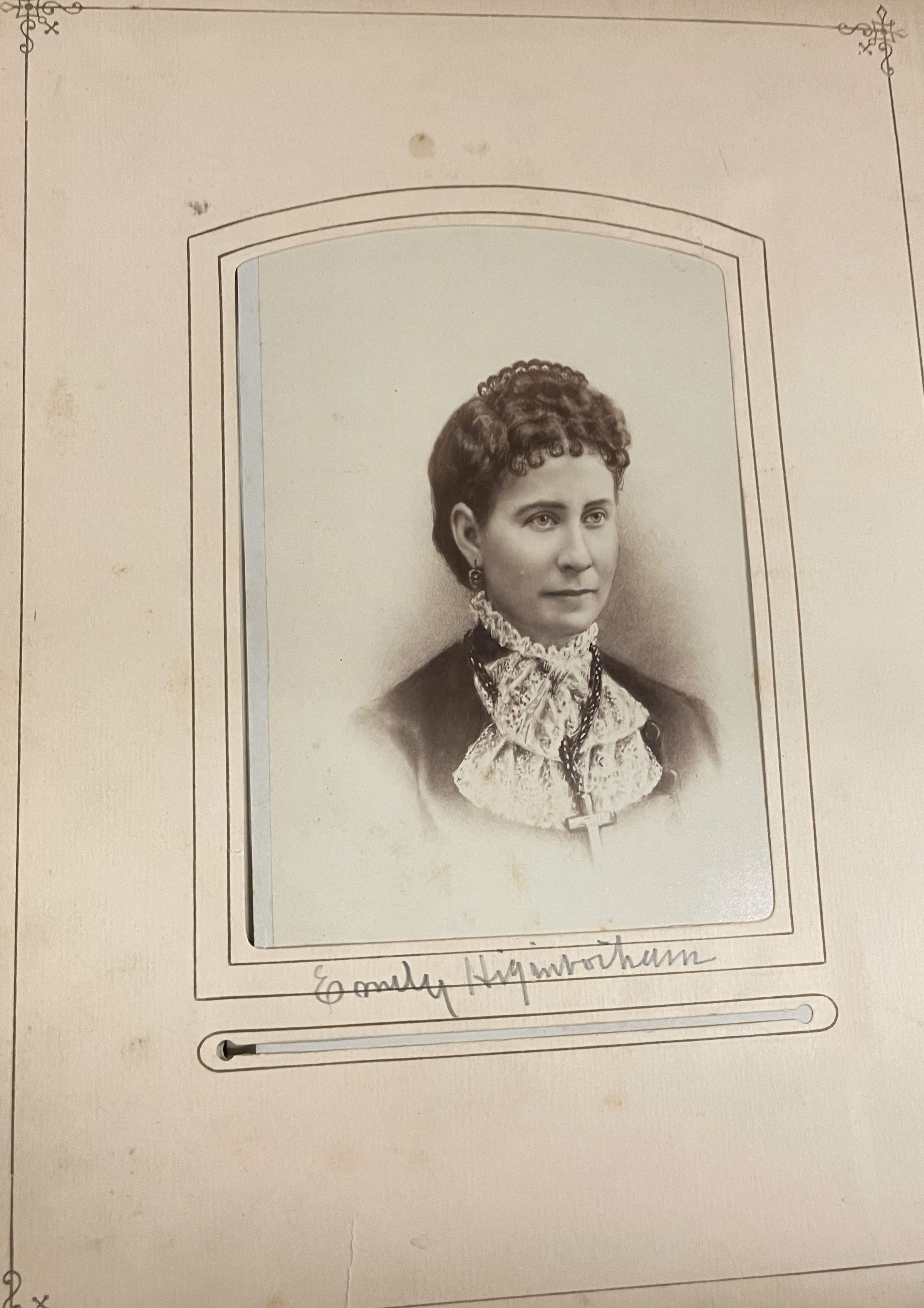 SOURCE CITATION: Phelan-Walker Album, Photo 48 - Emily J. (Wells) Higginbotham [1840-1883]; circa 1880; item no. WAYN-AN008-0048, Waynesburg University Paul R. Stewart Museum Collection, Greene Connections Archives Project (www.GreeneConnections.com).