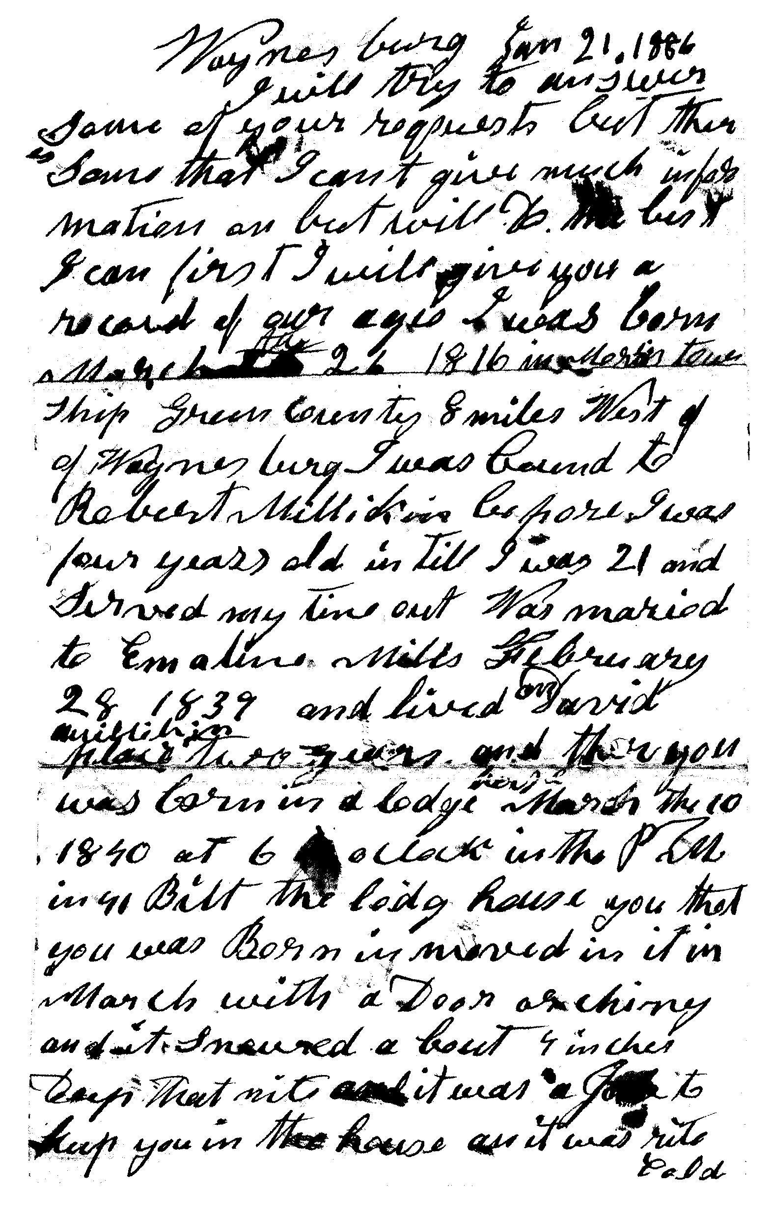 Robert Morris, (Waynesburg, Pennsylvania) to David Morris, letter, 21 January 1886; Lois (Morris) Gdovin Collection, privately held by Celia (Gdovin) Riggle, Eldon, Missouri, 2012. Transcribed by Keith Riggle. TRANSCRIPT PAGES 1-2: "Waynesburg Jan 21, 1886 I will try to answer some of your requests but there is some that I can't give much information on but will do the best I can. First I will give you a record of our ages. I was born on March the 26 1816 in Morris township Greene County 8 miles West of Waynesburg. I was bound to Robert Millikin before I was four years old in till [sic] I was 21 and served my time out. Was maried [sic] to Emaline Mills February 28 1839 and lived on David Millikin place two years and then you was born in a lodge house March the 10 1840 at 6 oclock in the P.M. In [18]41 bilt [sic] the lodg [sic] house you that you was born in moved in it in March with[out?] a door or chiny [sic] and it snowed about 4 inches deep that nite and it was a job to keep you in the house as it was rite cold. Isabell was born in that house Sept 22 1841 at 4 oclock P. M. we lived in that house untill [sic] Nov [18]43 then move to a lodg house in site of Applegates and staid [sic] there untill the Spring of [18]47 then to a farm on the run above Braddock Church. There your mother became so feeble that she moved to your grandfathers and your mother died July 1st 1847 at half past one oclock in the A.M. James H. was born January 25 1844 at 5 oclock P.M. Your mother was born Sept 19 1821. Your Grandfather Mills was born on the farm in Washington County where the town of Millsborough stands. Your Grandmother Mills name was Ulery her fathers name was Stephen and ended his life by cutting his throat with a razor the cause not nowing [sic?]. They lived about 4 miles from Millsborough."
