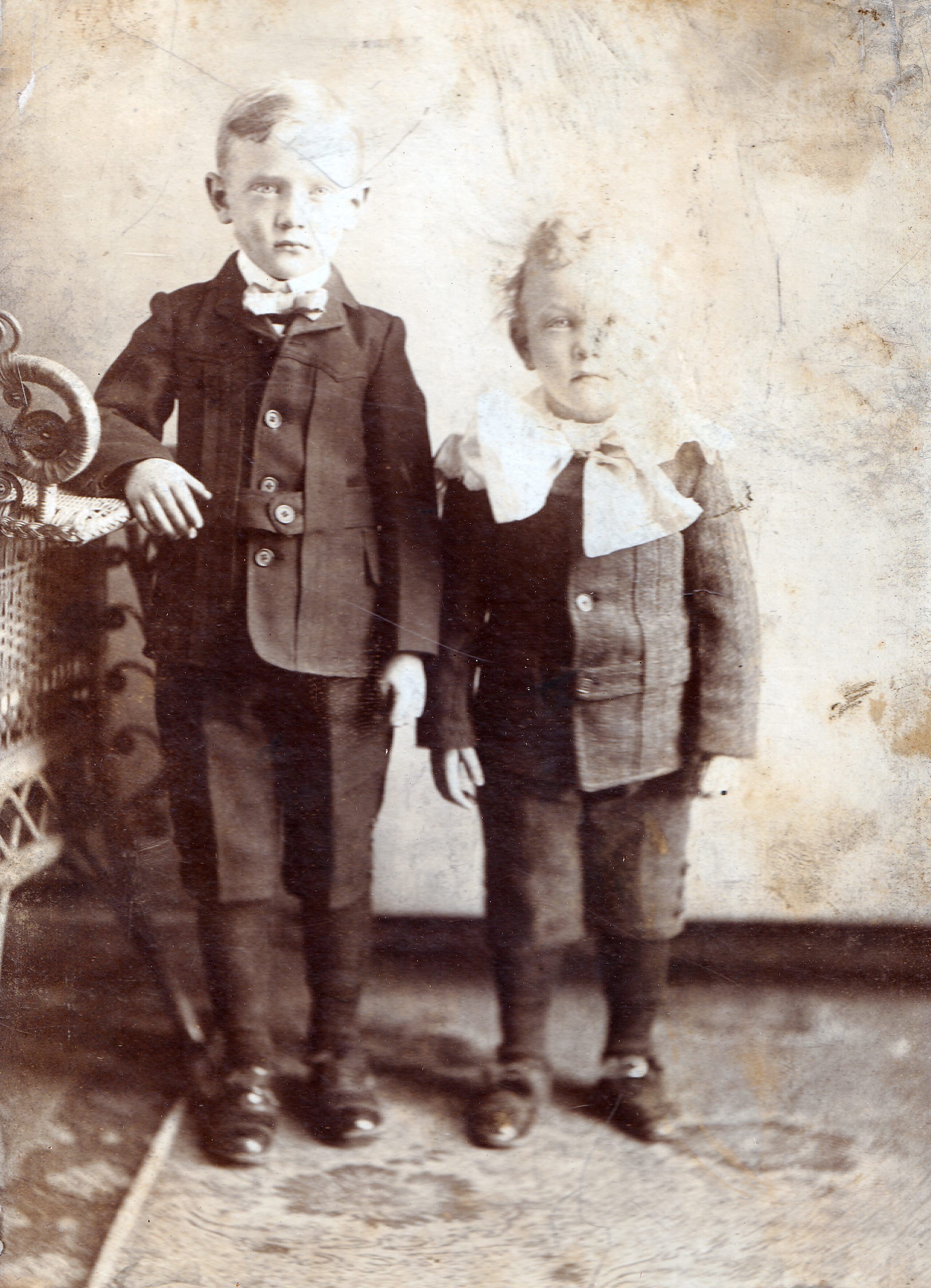 SOURCE CITATION: Ammons-Acklin Album, Photo 07 - [Left-Right]: Roy Eugene Ammons [1897-1963] and Arthur Ammons [1900-1975] - sons of Ellmeth Finley Ammons and Anna Covert Acklin; circa 1900-1905; item no. MORE-AN005-0007, Ammons-Moredock Collection, Greene Connections Archives Project (www.GreeneConnections.com).
