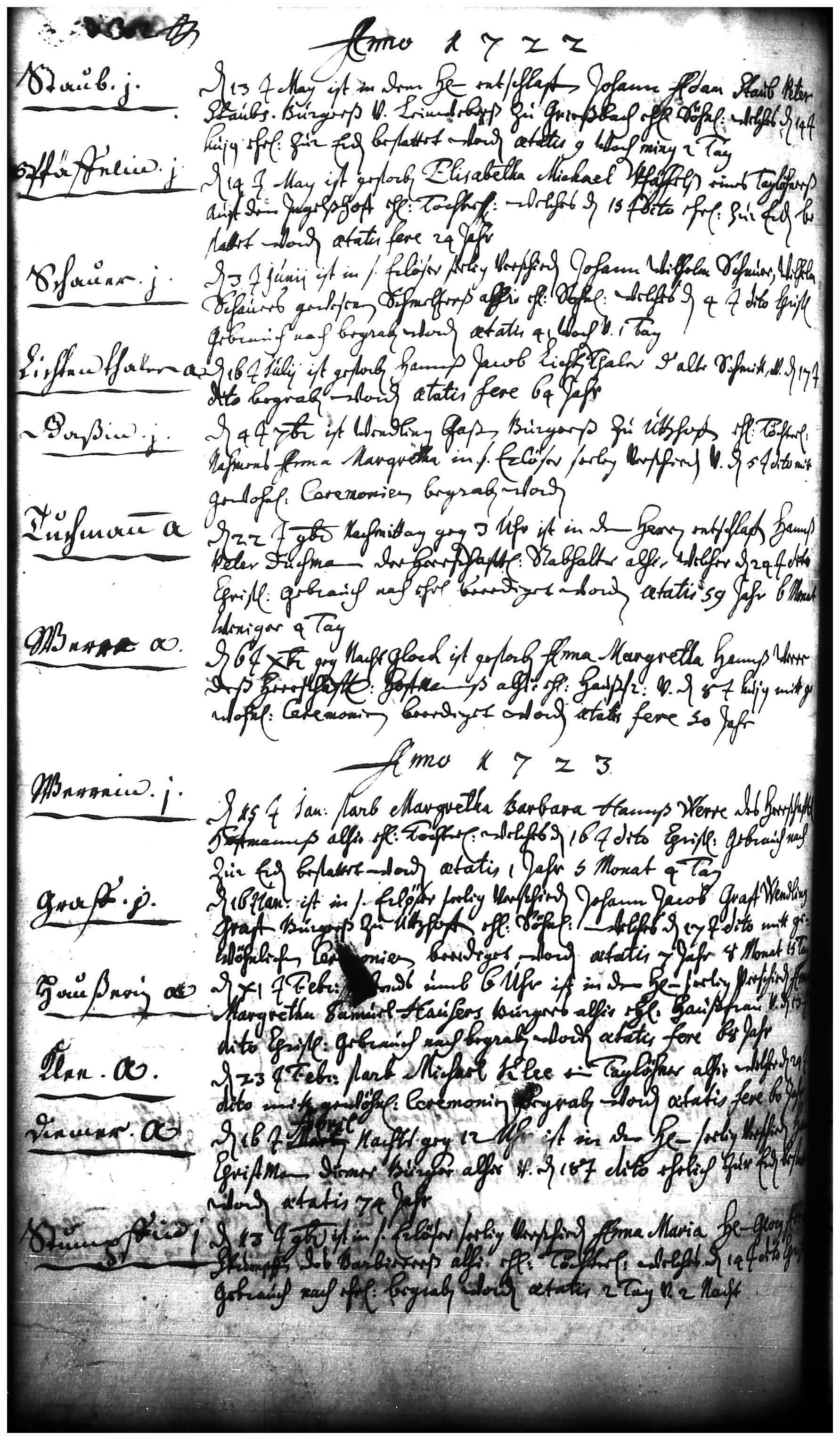 den 16t April Nachts gegen 12 Uhr ist in dem Herrn seelig verschieden H[ans] Christmann Diemer Bürger alhir u. den 18t. dito ehrlich Zur Erde bestatte worden. aetatis 74 Jahr"