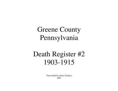 Contains a complete transcription of the records found in the second of two Death Registers found in the Greene County Courthouse in Waynesburg, Pennsylvania. This book contains deaths recorded between 1903 and 1915. Includes a complete name index.Collection