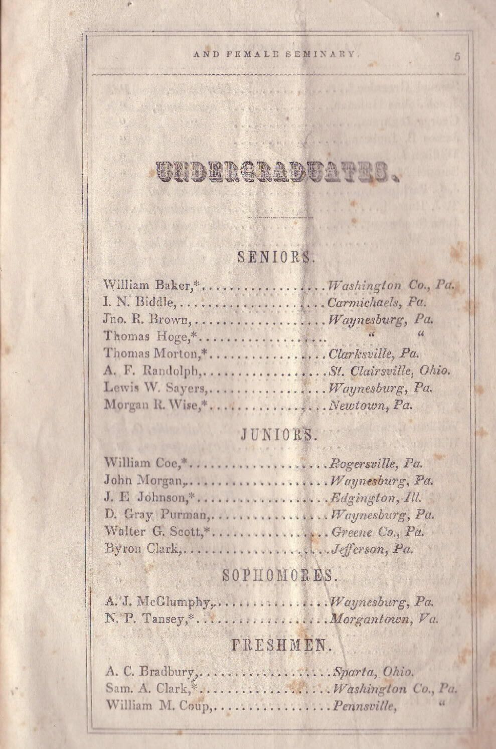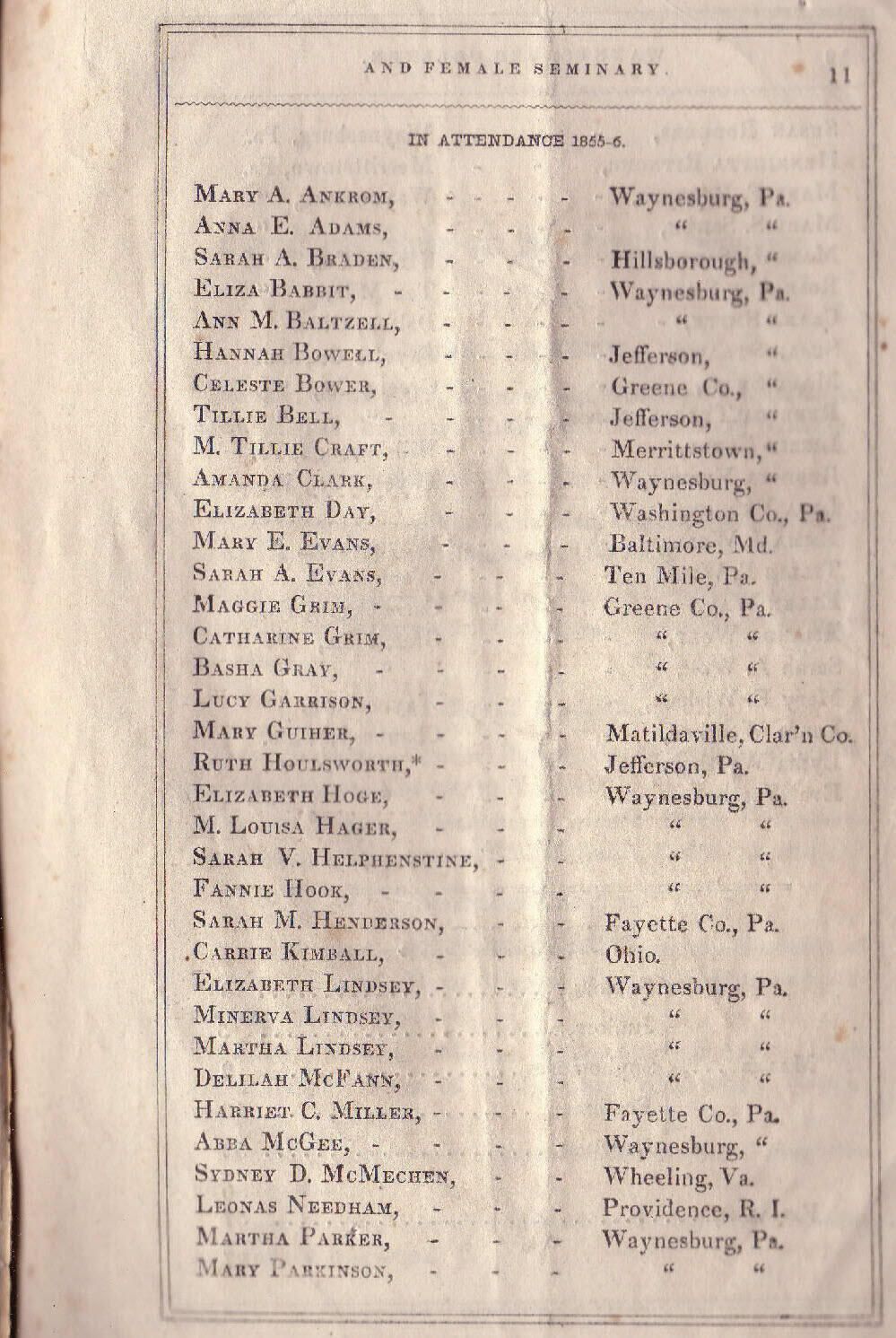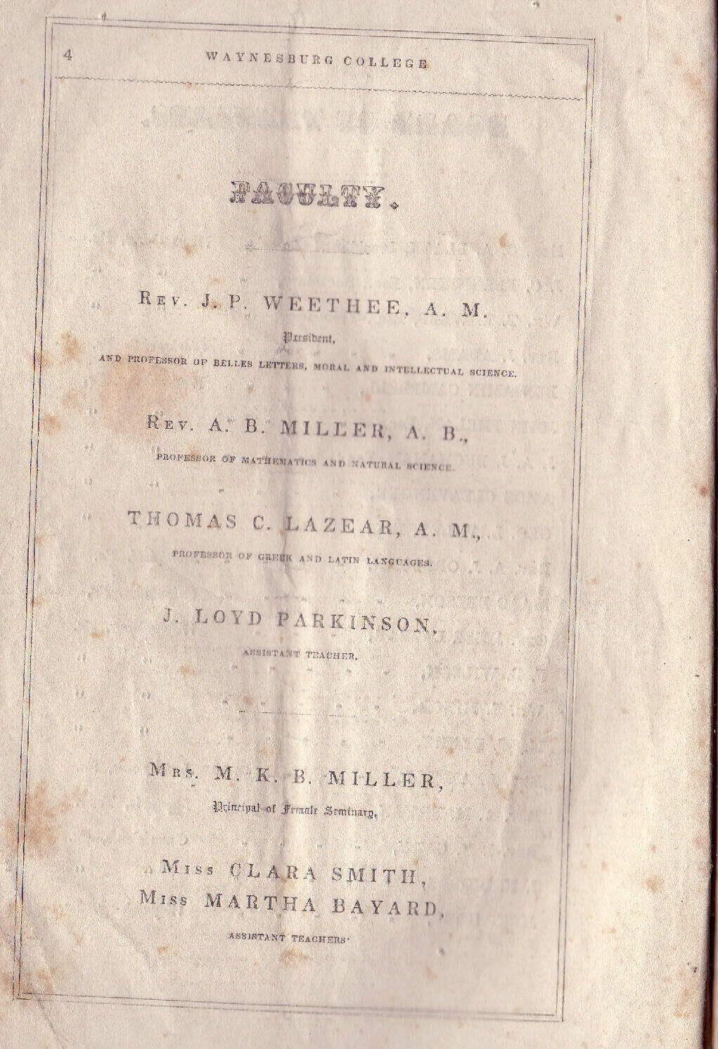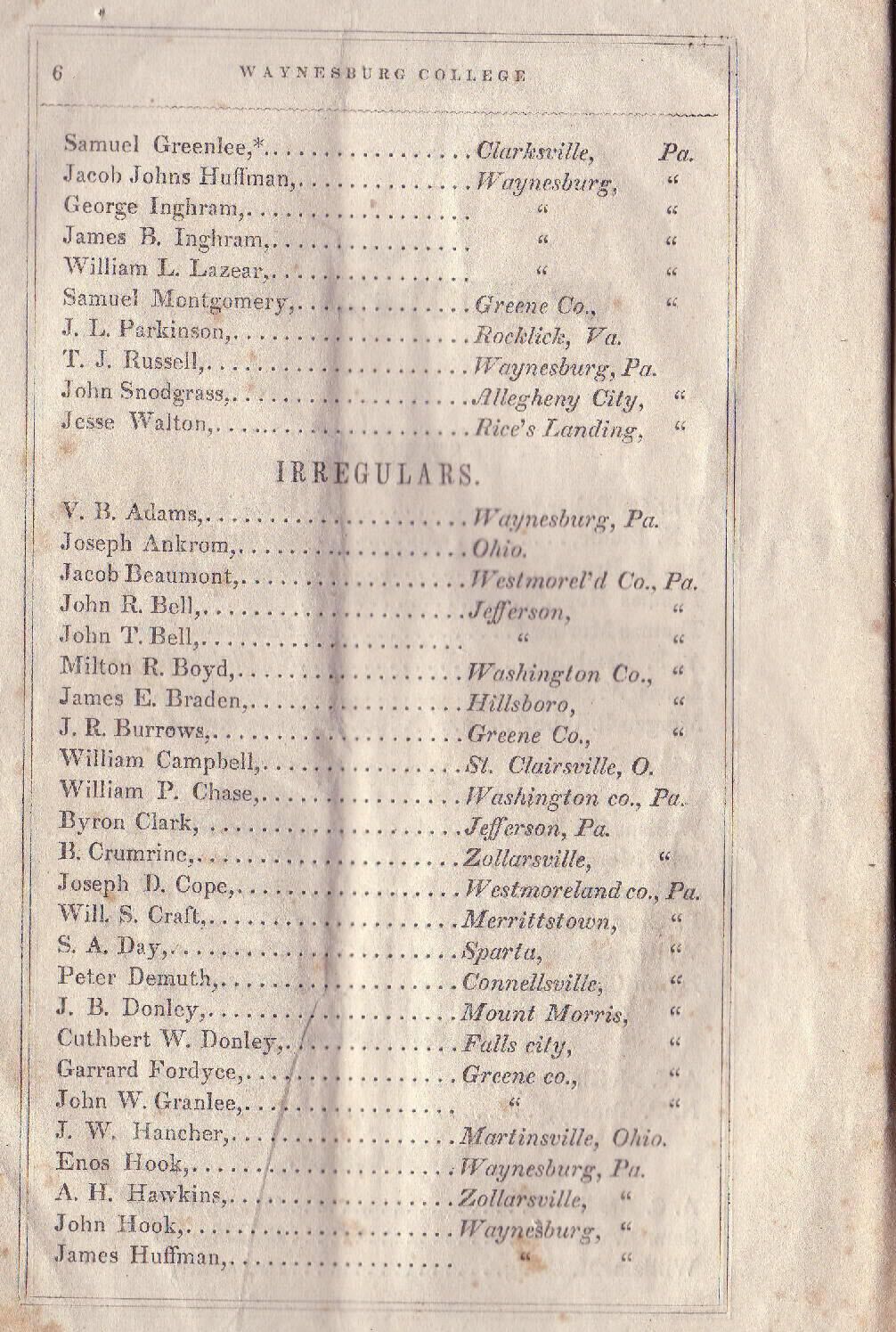 Baker, William [1831-1910], Biddle, Isaac Newton [1832-1871], Brown, John Reese (Rev.) [1828-1893], Helphenstine, Sarah J. [1839-1925], Hoge, Thomas [1834-1899], Lindsey, Minerva [1829-1898], Morton, Thomas, Randolph, A. F., Sayers, Lewis Wetzel [1838-1864], Smith, Clara [1834-1910], Ulery, Elizabeth Jane [1839-1877], Wise, Morgan Ringland [1825-1903]