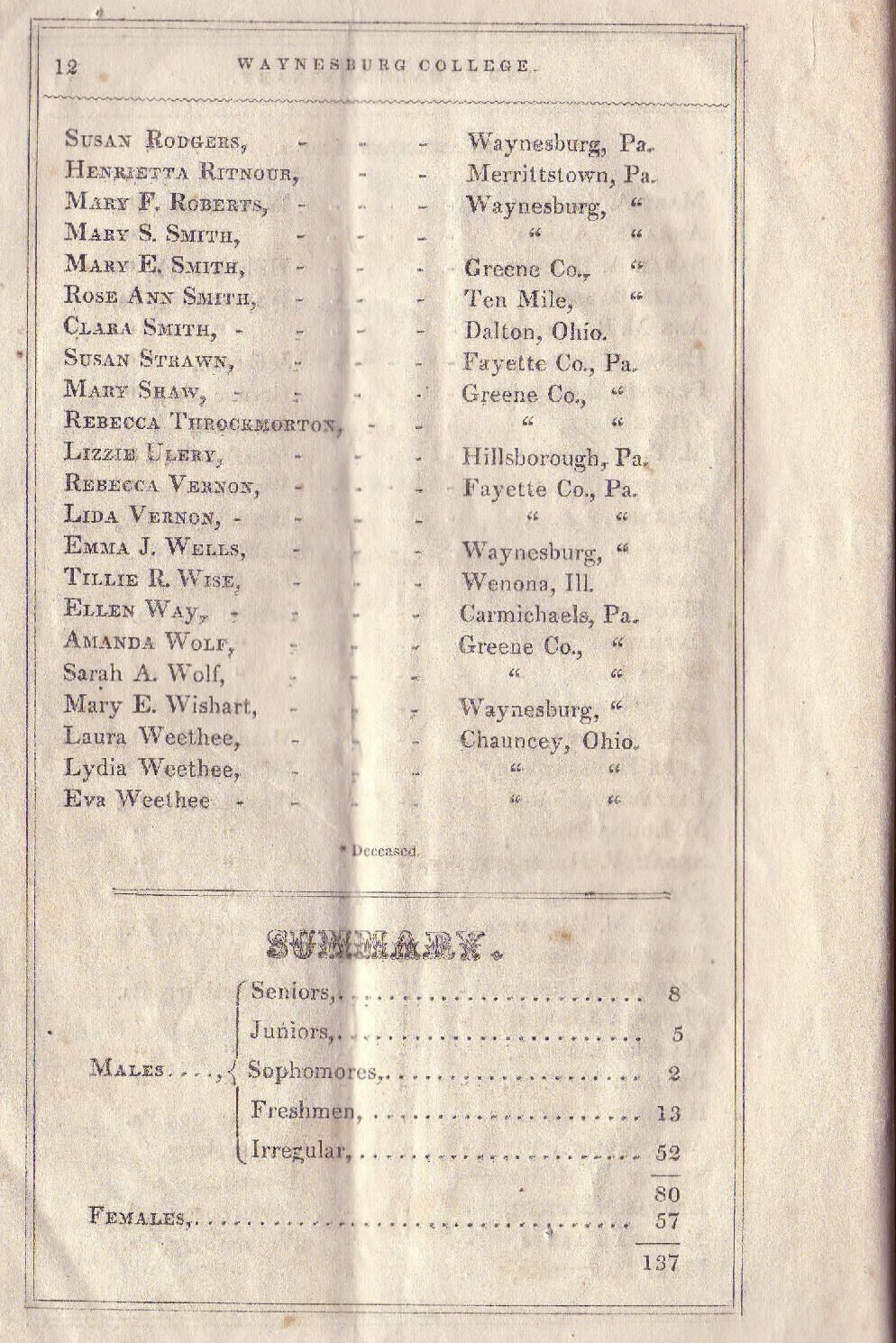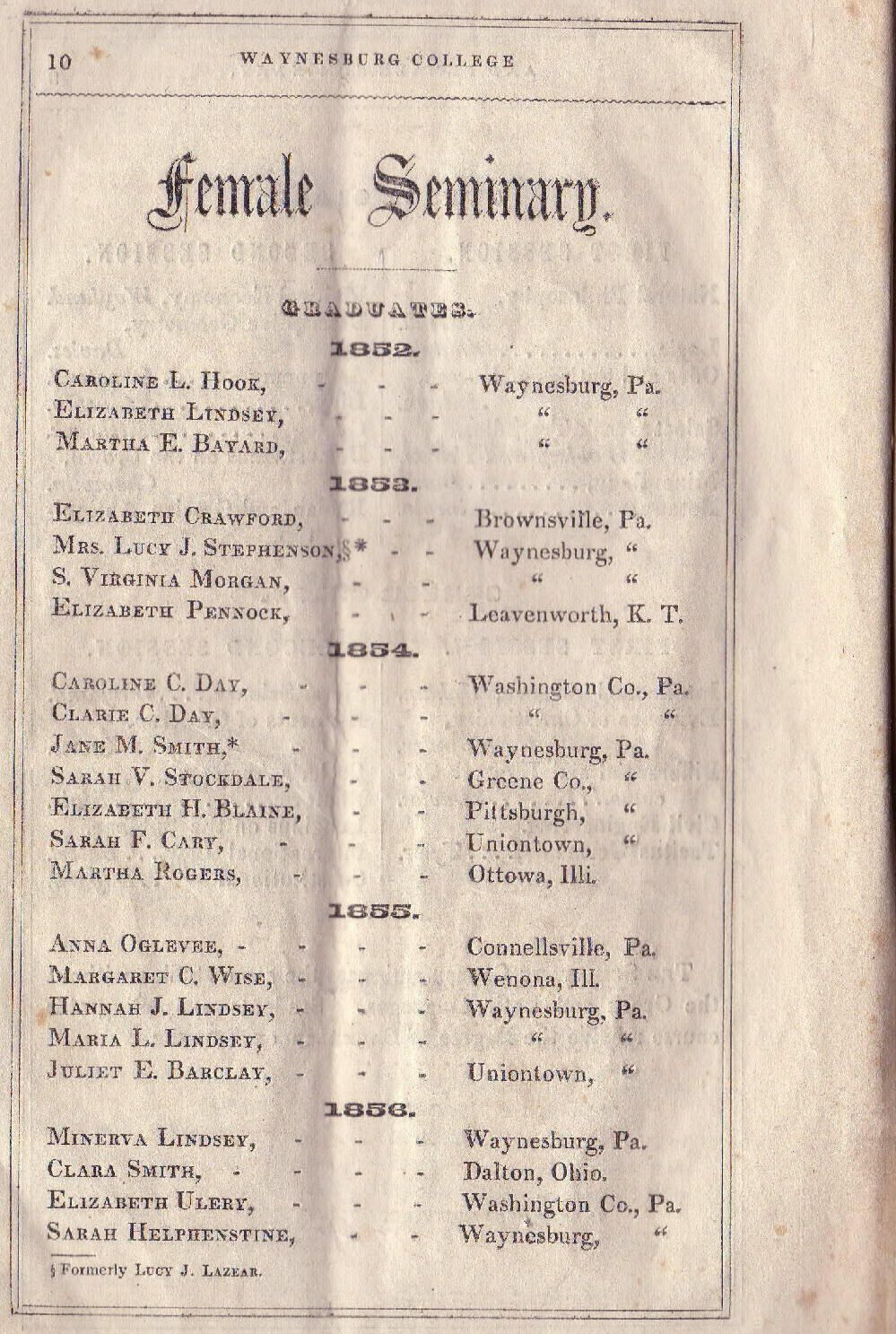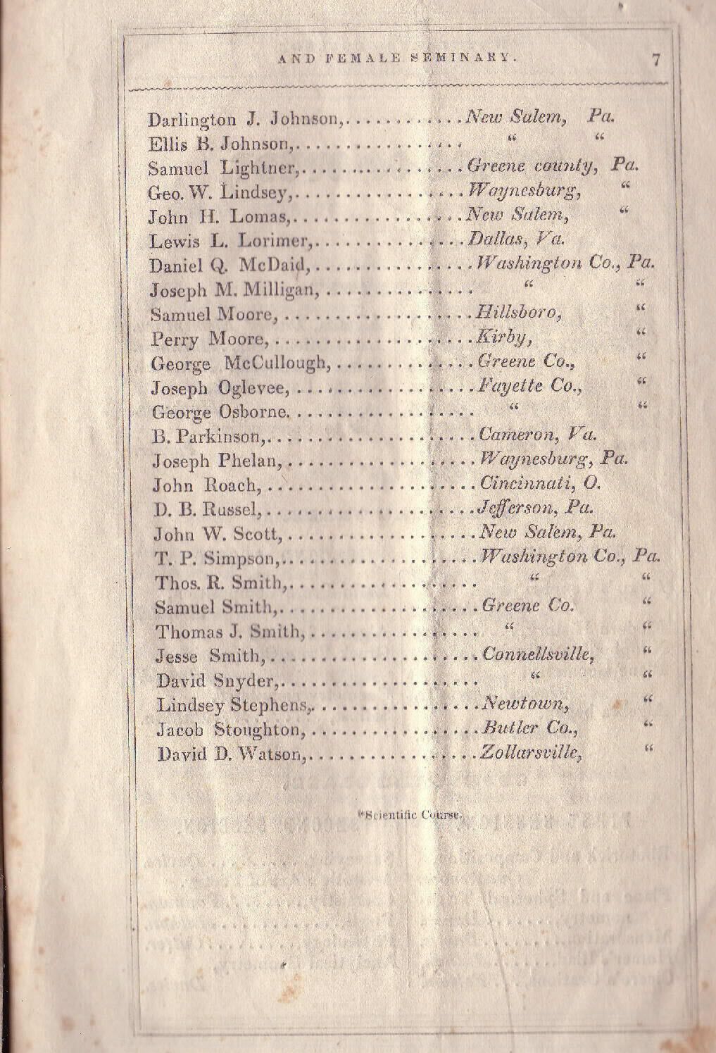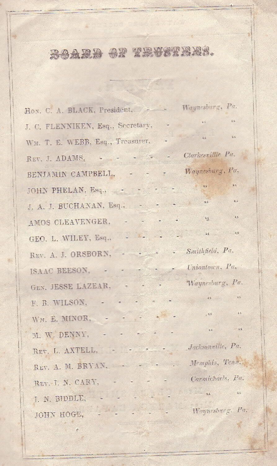 Baker, William [1831-1910], Biddle, Isaac Newton [1832-1871], Brown, John Reese (Rev.) [1828-1893], Helphenstine, Sarah J. [1839-1925], Hoge, Thomas [1834-1899], Lindsey, Minerva [1829-1898], Morton, Thomas, Randolph, A. F., Sayers, Lewis Wetzel [1838-1864], Smith, Clara [1834-1910], Ulery, Elizabeth Jane [1839-1877], Wise, Morgan Ringland [1825-1903]