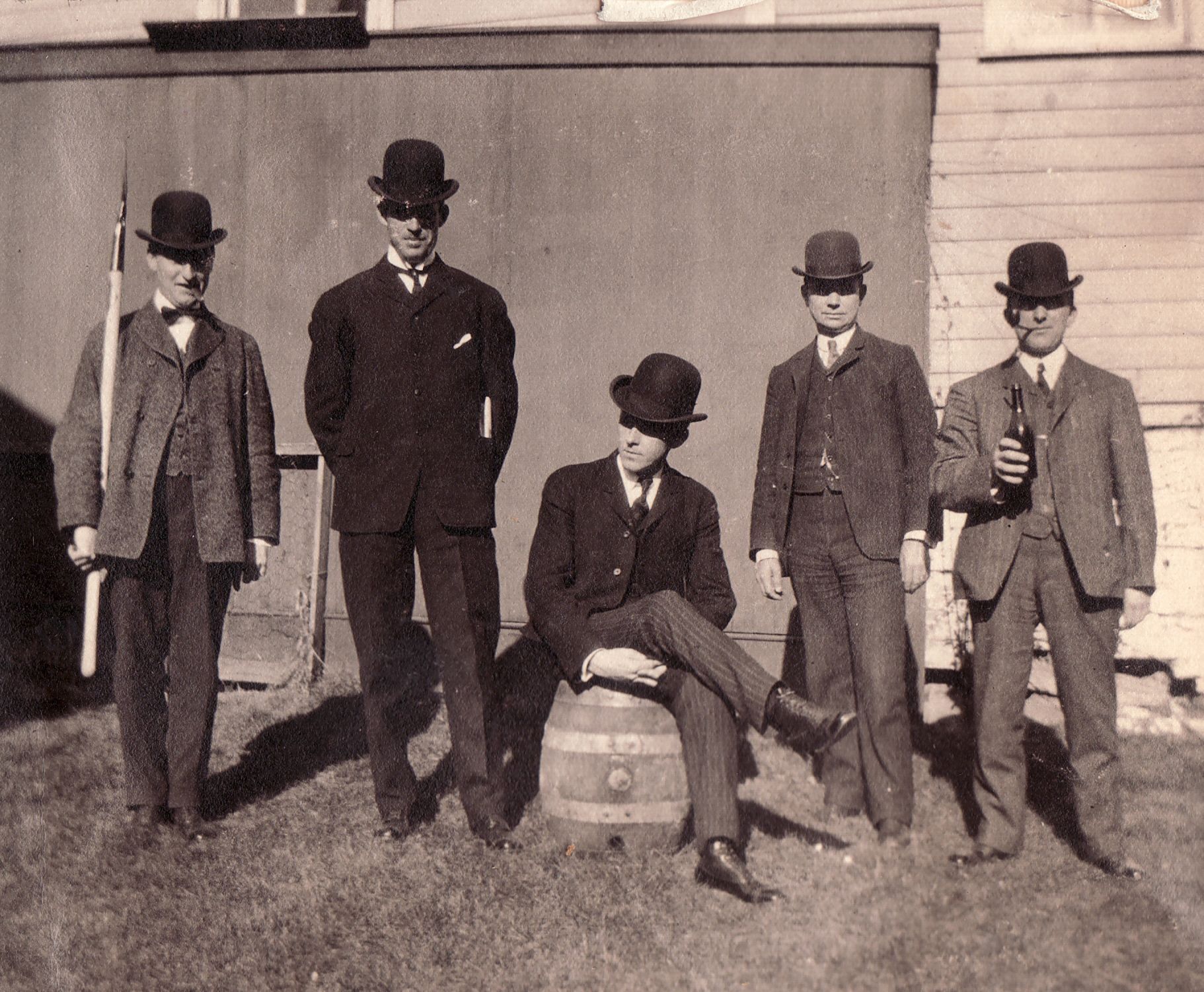 SOURCE CITATION: Waynesburg Album, Photo 15 - [Left-Right]: Andrew Armstrong Purman Jr. [1872-1943], George David Jenkins [1868-1936], John Sherwood Carter [1868-1947], Mr. Grimm, Mr. Skelton; dated Christmas 1904; item no. GCHS-AN031-0001-0015, George David Jenkins Series, Greene County Historical Society Collection; Greene Connections Archives Project (GreeneConnections.com).