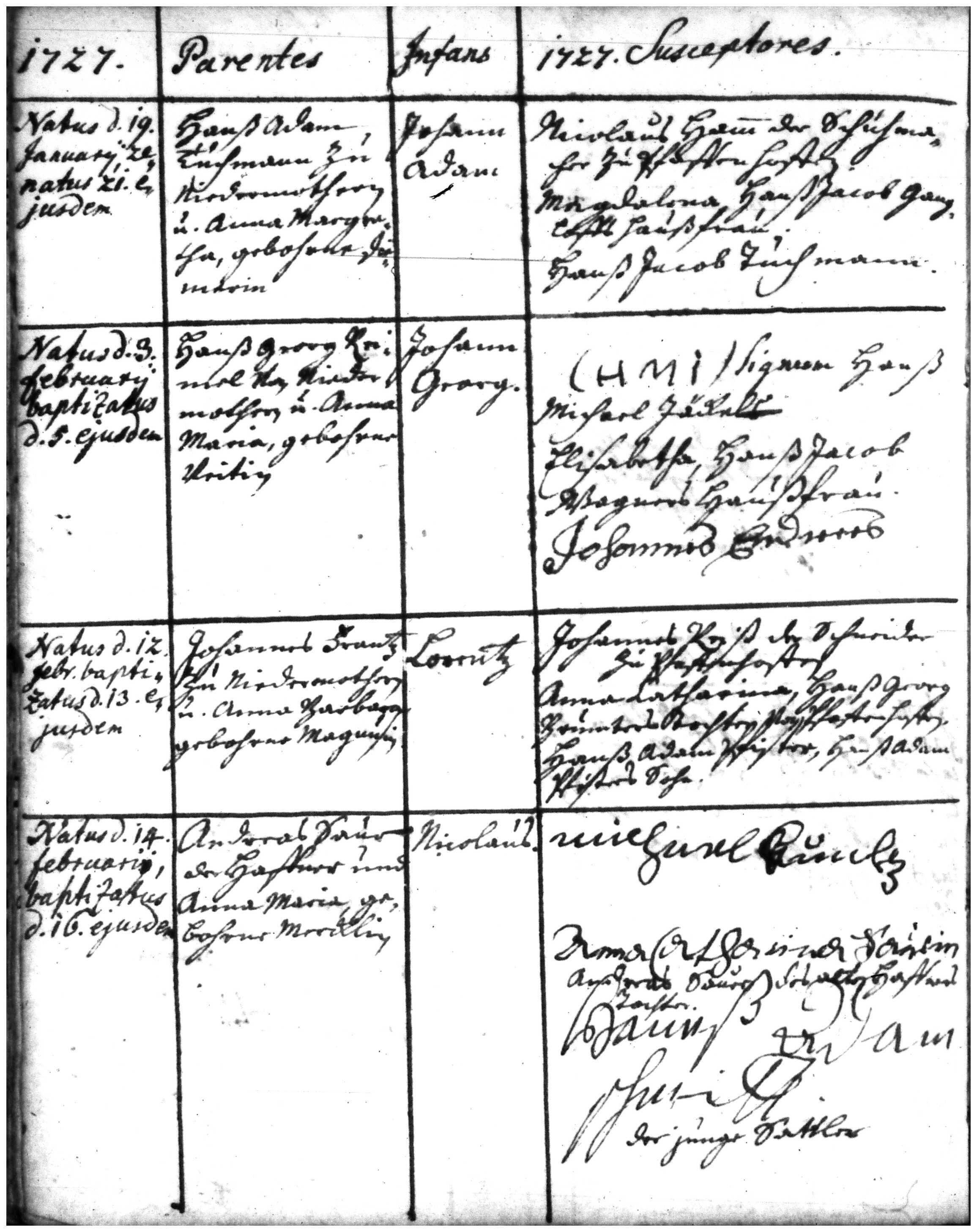 SOURCE CITATION: Evangelische Kirche Pfaffenhofen (Kr. Zabern) (Alsace, France), Kirchenbuch, page 91, Johann Adam Tuchmann birth and baptism; FHL microfilm 785828, 8 rolls; item no. 2016.1.74, Toothman Series, Glenn Jacob Roy Thornton Toothman III Collection, Greene Connections Archives Project (www.GreeneConnections.com).