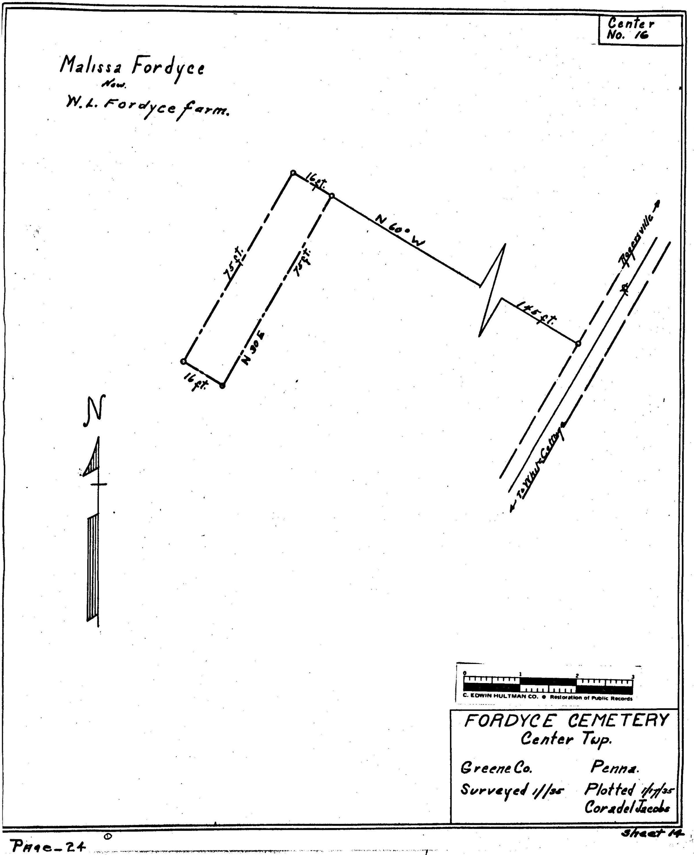 Source Citation: WPA Cemetery Plat - Pennsylvania - Greene County - Center Township - Fordyce Farm Cemetery (1935), item no. 2016.3.32, Cemetery Plat (WPA) Collection, surveyed by Works Projects Administration, copy on file at the Clerk of Courts Office, Greene County Courthouse, Greene Connections Archives Project (www.GreeneConnections.com).