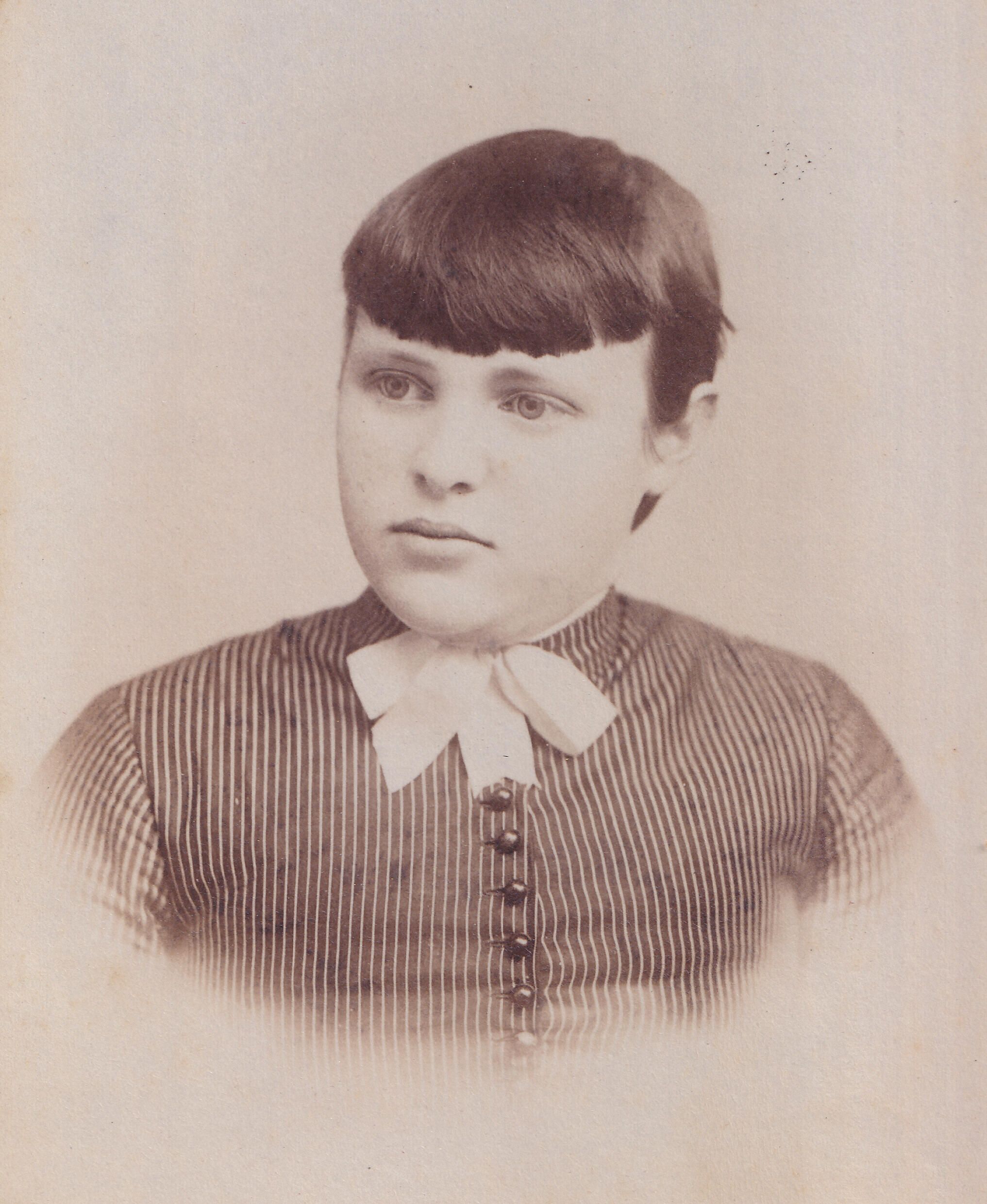 SOURCE CITATION: Ammons-Moredock Album 02, Photo 13 - Mary Louisa (Ammons) Eaglen [1869-1959]; circa 1880-1890, image by T. A. Sharpnack, Brownsville, Pa.; item no. MORE-AN003-0013, Ammons-Moredock Collection, Greene Connections Archives Project (www.GreeneConnections.com).