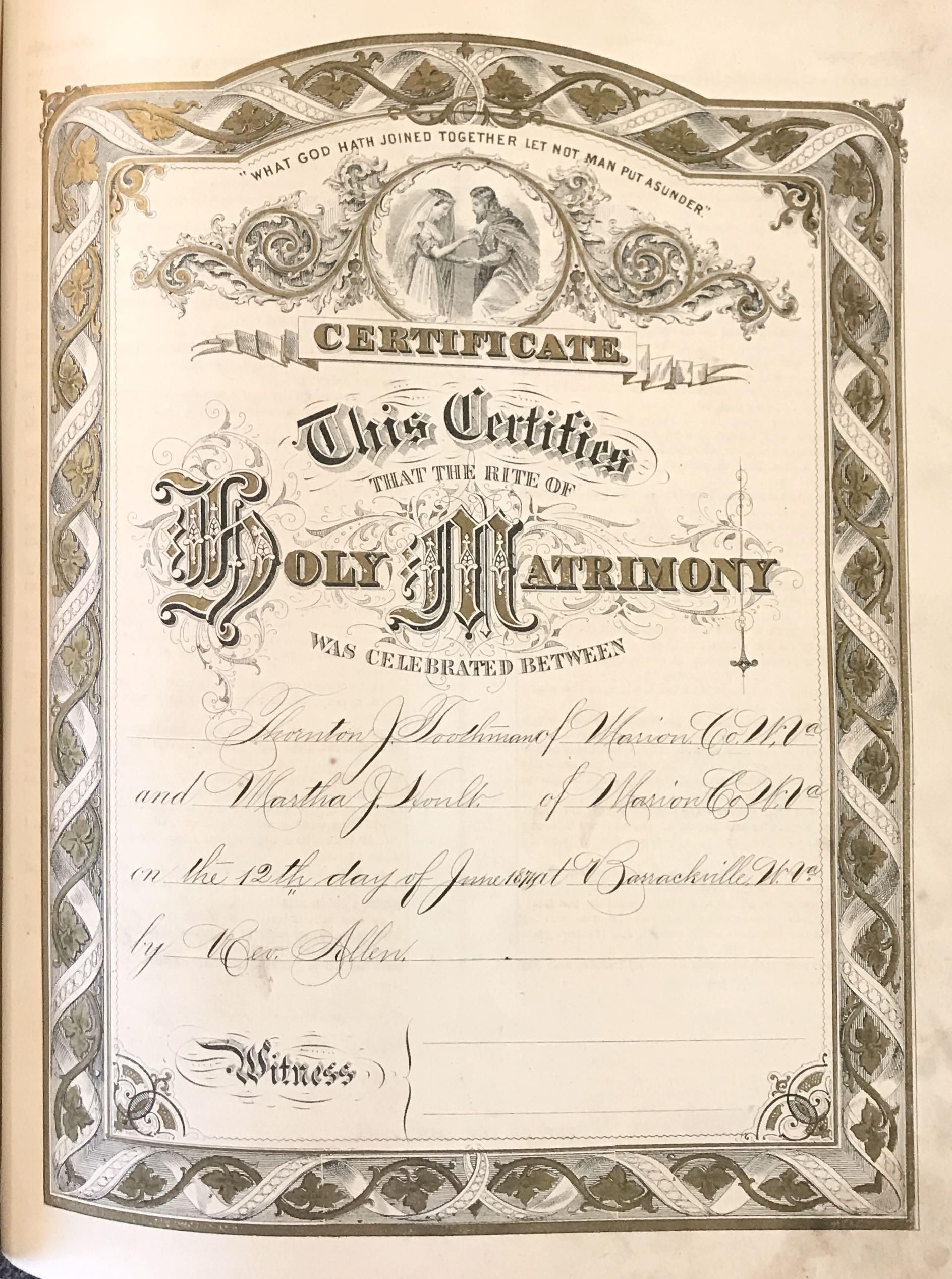 "This Certifies / That The Rite Of / Holy Matrimony / Was Celebrated Between / Thornton J. Toothman of Marion Co. W. Va. / and Martha J. Hoult of Marion Co., W. Va. / on the 12th day of June 1871 at Barrackville W. Va. / by Rev. Allen."