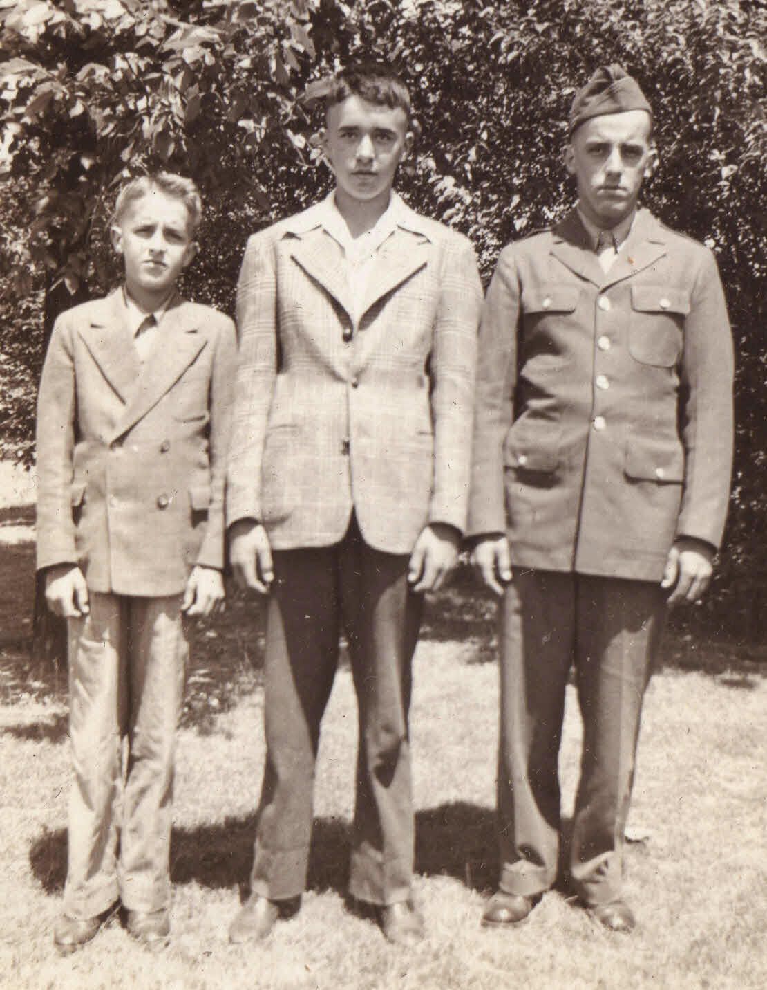 SOURCE CITATION: Read Rollins Bristor and Garnet (Watson) Bristor family, pictured [Left-Right]: Lawrence Rollins "Rollie" Bristor, Donald Bristor, Gerald Bristor; circa 1945; item no. BRIG0008, Bristor Series, Garnet (Watson) Bristor Collection, Greene Connections Archives Project (www.GreeneConnections.com).