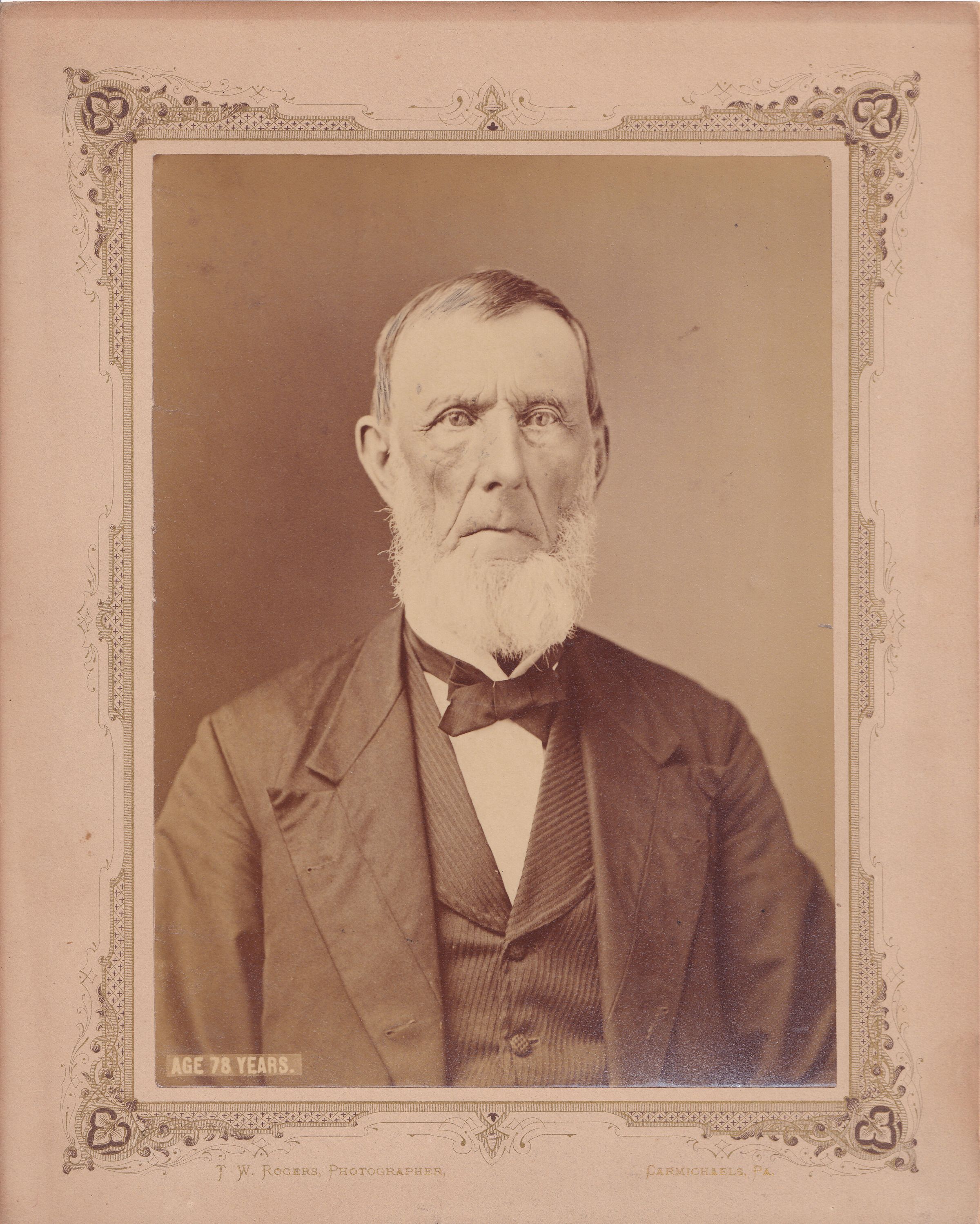 SOURCE CITATION: Ammons-Acklin Album, Loose in album - Benjamin Covert [1799-1890], age 78 years; circa 1877, image by T. W. Rogers, Photographer, Carmichaels, Pa.; item no. MORE-AN005-0008, Ammons-Moredock Collection, Greene Connections Archives Project (www.GreeneConnections.com).