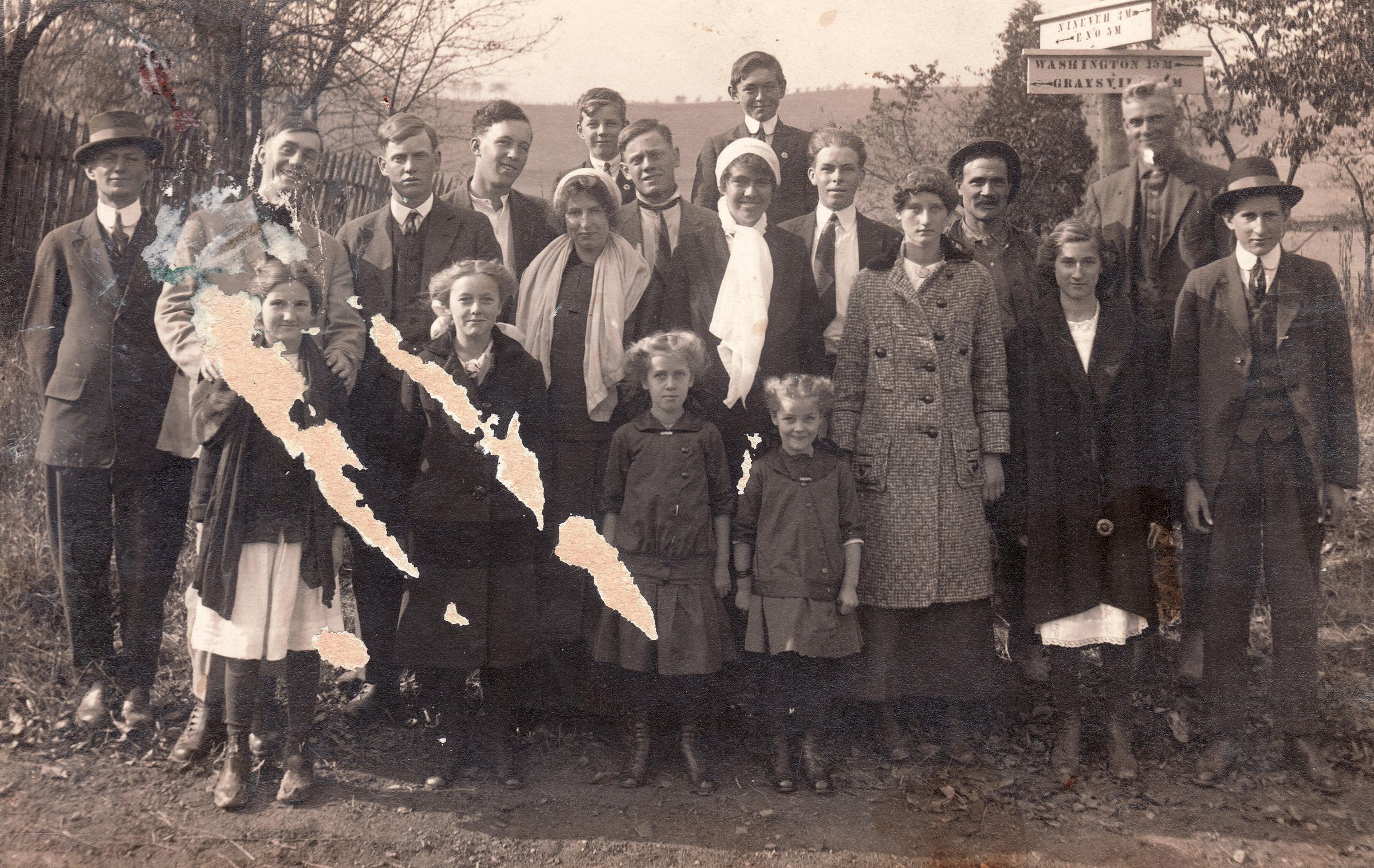 SOURCE CITATION: Clutter family and friends standing at an intersection near the Greene and Washington County, Pennsylvania border; dated 7 November 1915; item no. SUPL-AN005-0010, Clutter Series, Wayne Carl Swart Collection, Greene Connections Archives Project (www.GreeneConnections.com).