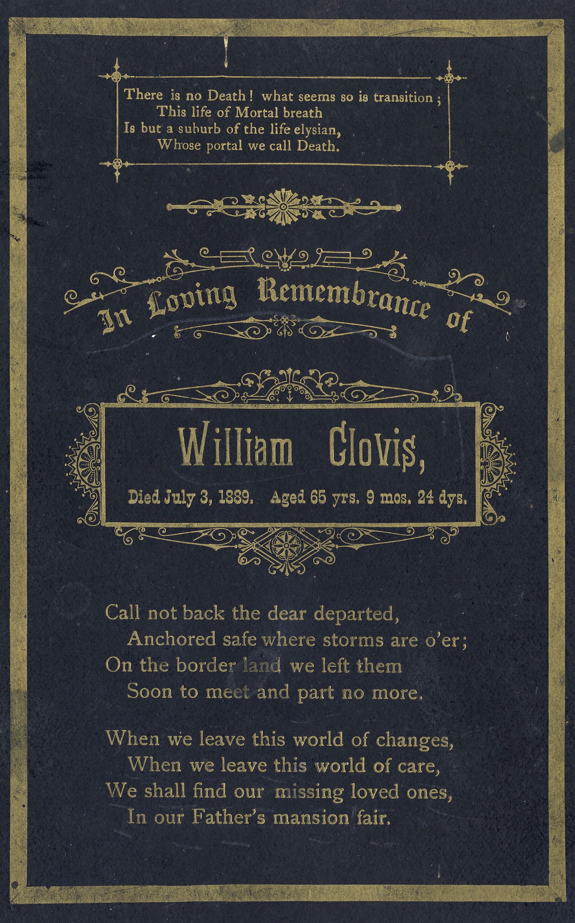 Source Citation: Funeral card of William Clovis [1823-1889], item no. HOYJ-AN002-0002, Athaliah Frances (Clovis) Hoy Collection, shared by James Michael Hoy, Greene Connections Archives Project (www.GreeneConnections.com).