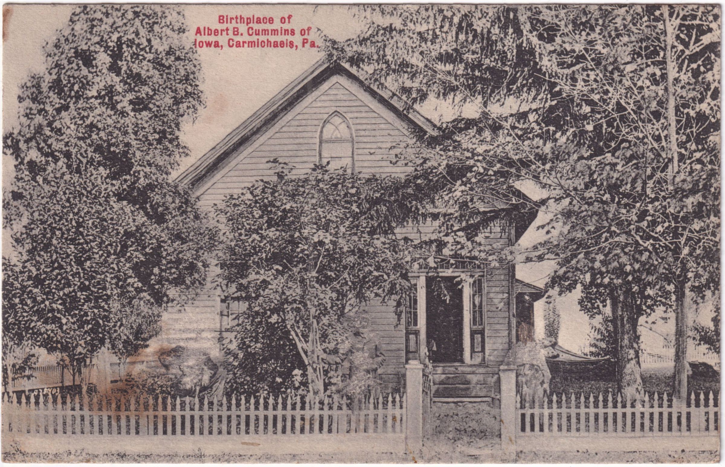 Real-photo postcard of the house in Carmichaels, Greene County, Pennsylvania, which was the birthplace of Albert Baird Cummins [1850-1926], Waynesburg College, Class of 1867 - son of Thomas Layton Cummins and Sarah Baird Flenniken.