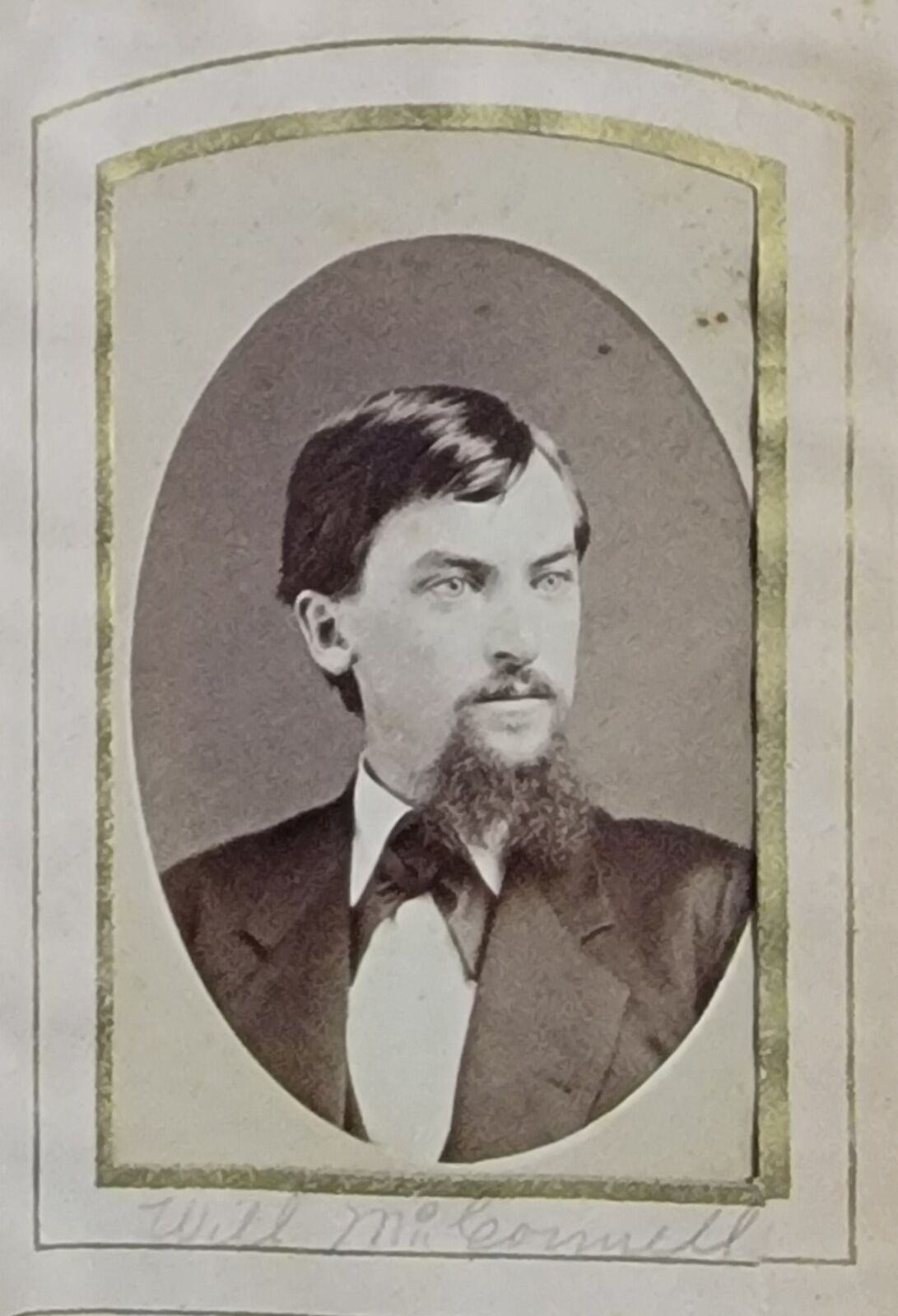 ACQUISITION NOTE: The photograph was purchased in combination with an identified image of William's first wife, Sarah Bonar "Sadie" (Buchanan) McConnell (item # CAND-AN007-0031), via eBay auction in 2024, by Candice Lynn Buchanan. Per correspondence with the eBay vendor, we know that the images were both obtained at a large estate sale in Illinois. Several antique albums yielded at least 100 images. The vendor photographed the album pages before removing each image from the album to be sold separately on eBay. Though the images were identified in the album with handwritten inscriptions, the eBay listings did not include those captions. Candice discovered the images while searching eBay for items associated with Waynesburg, Pennsylvania. Due to many years of associated research, she recognized Sadie immediately. To help ensure accuracy and prevent bias, Greene Connections volunteer Glenn Toothman also compared the eBay item with Sadie's Waynesburg College, Class of 1868 graduation picture (item # WAYN_AN001_1868_0001). To determine if any additional or related images might be available, Candice looked at the vendor's entire listings and quickly discovered the image of Sadie's husband, identifiable by comparison to a later picture of him published in The Record: Historical, Personal and Other Sketches, Politics, Literature and Education, Social and Fraternal Affairs, Illustrated (Fargo, N.D.: Clement A. Lounsberry, 1895–1905), photograph of William McConnell [WorldCat: https://search.worldcat.org/en/title/12388412]. Though neither image was captioned on eBay, further evidence to support the identifications lay in the fact that the vendor had posted these two CDVs with Waynesburg, Pennsylvania, photographer stamps, in combination with 20 images from Angola, Indiana. William had taken Sadie to live with his family in Angola, Indiana, after their marriage in Waynesburg on 9 September 1869. At this point, Candice contacted the eBay vendor to request any known provenance or ties to additional images. The vendor supplied the details stated here, in combination with images of the album pages bearing the original inscriptions that confirmed the identities of Sadie and William. A younger photo of William that had appeared beside Sadie in the album had already been sold [this picture has since been reunited, see item # CAND-AN007-0033]. The vendor reviewed the entries for additional family members and found a cabinet card identified as William's second wife, Emma (Vandercook) McConnell, which Candice could still acquire. Based on the evidence at hand, it seems most likely that these McConnell images (4 in total, 1 of Sadie, 2 of William, and 1 of Emma) were in a collection that belonged to friends or relatives of the McConnells in Angola, Indiana. Though it would have been ideal to acquire the collection intact with original order and context, we are extremely grateful to the vendor who promptly did all they could to help us document and identify these precious images.