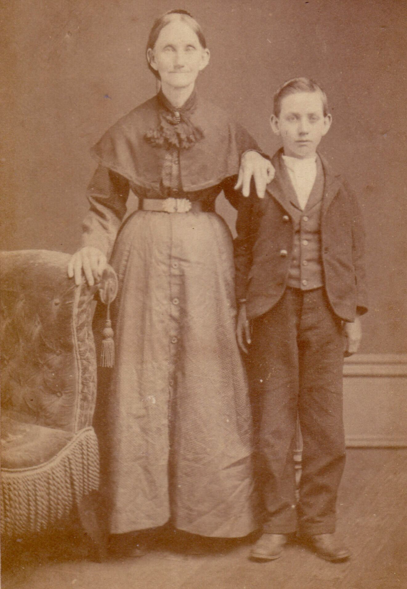 SOURCE CITATION: Priscilla (Dye) Meighen [1824-1897] and her youngest son, Peter Meighen Jr. [1867-1946]; circa 1875-1885, image by S. G. Rogers, Photographer, Waynesburg, Pa.; item no. THOM0003, Meighen Series, Helen Lee (Garrison) Thompson Collection, Greene Connections Archives Project (www.GreeneConnections.com).