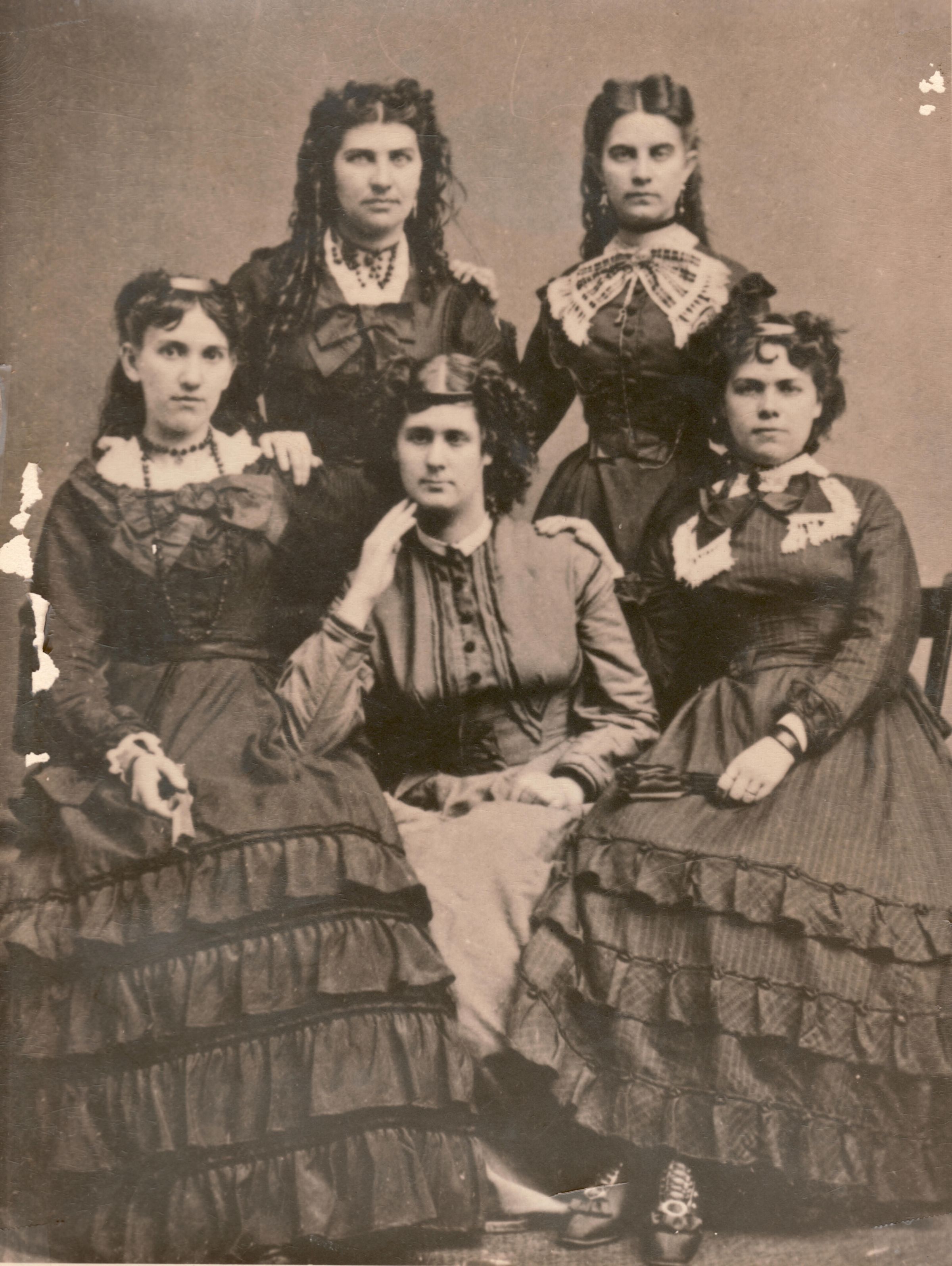 The class roster shows the following women who may be pictured: Amy Ammons, Jennie (Ammons) Bailey, Henrietta (Iams) Ray, Sarah Anna (Overturf) Coen, Mary (Rohrer) Hail.