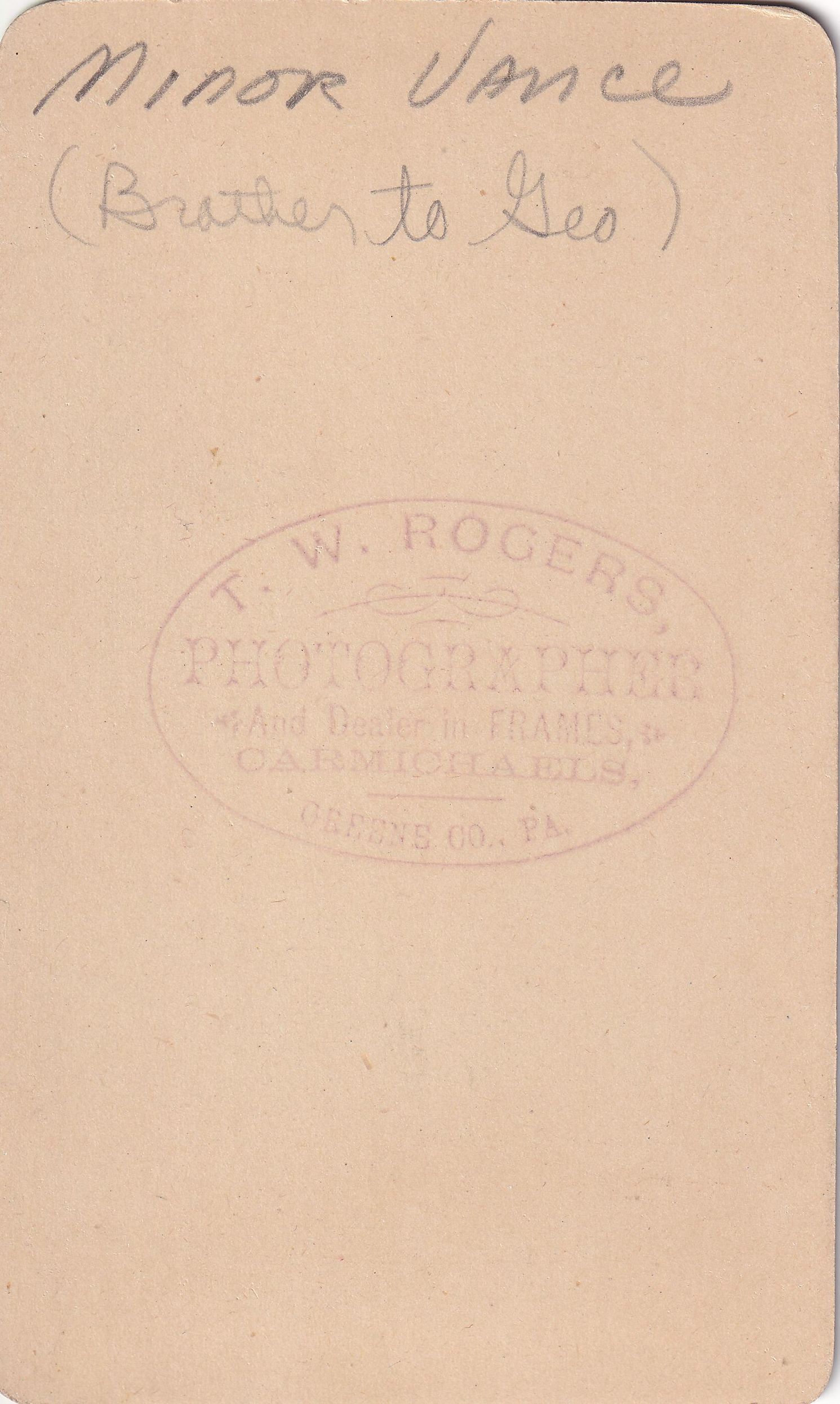 SOURCE CITATION: Minor Vance [1874-1941] - son of George Vance and Gredelia Rice; circa 1885-1895, image by T. W. Rogers, Photographer and Dealer in Frames, Carmichaels, Greene Co., Pa.; item no. MILB-AN001-0006-0028, Vance Series, Mary (Vance) McCann Collection, shared by her grandson, William Marshall Miller; Greene Connections Archives Project (www.GreeneConnections.com).