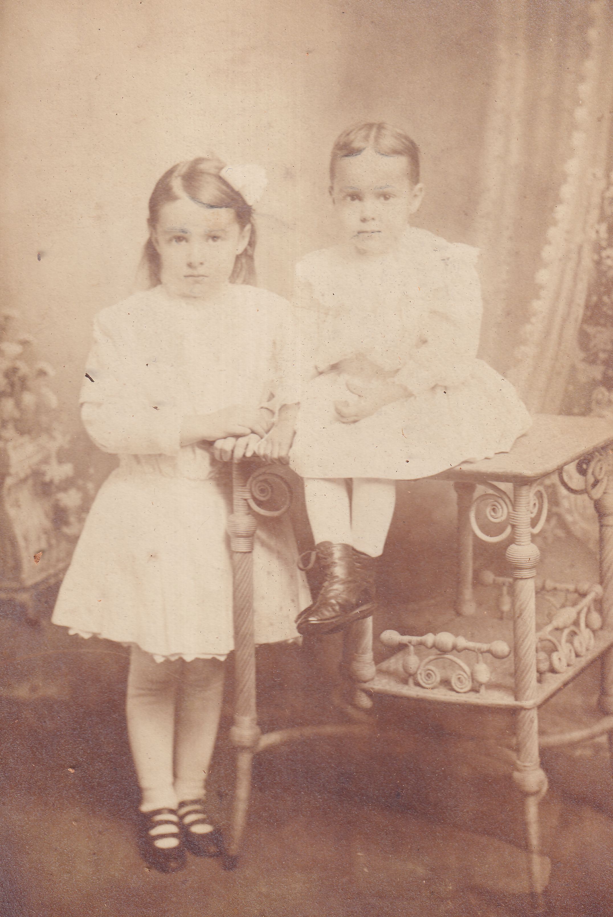SOURCE CITATION: [Left-Right]: Sarah Helen Cree [1907-2004] and Anna Pauline (Cree) Schroyer [1909-1972]; circa 1910-1912, image by Adamson, Waynesburg, Pa.; item no. MORS-AN004-0004, Cree Series, Ruth Cecilia (Morris) (Shultz) Minor Collection; Greene Connections Archives Project (GreeneConnections.com).