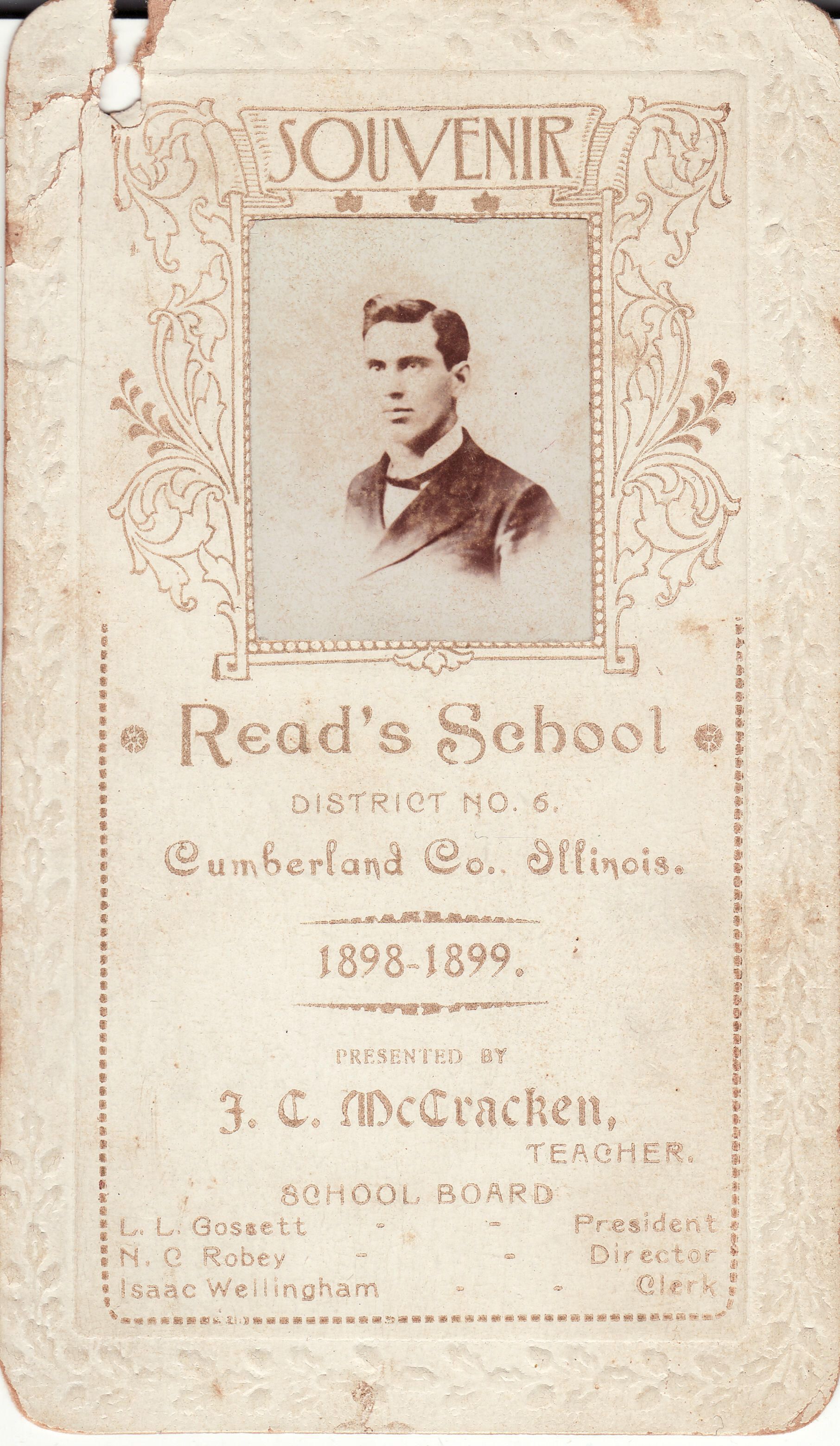 Source Citation: Souvenir program presented by J. C. McCracken, Teacher - Read's School, District No. 6, Cumberland Co., Illinois (Caption on reverse reads, "John McCracken, boyfriend"); 1898-1899; item no. SMIT-AN001-0013, Carrie Belle (Stewart) Smith Collection, shared by Amy Smith; Greene Connections Archives Project (GreeneConnections.com).