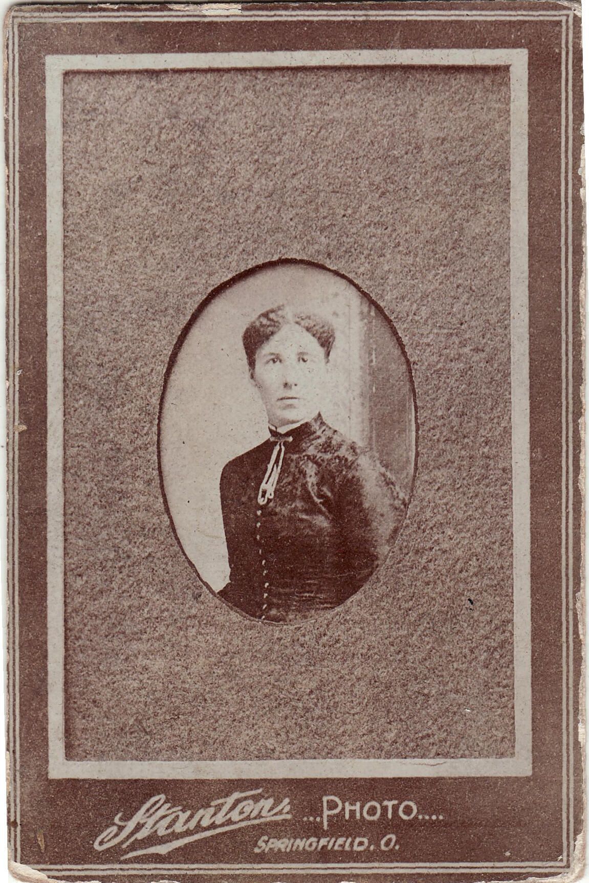 This photograph was reproduced circa 1905, by Stanton Portrait Co., Springfield, Ohio. They were not the original photographers. They advertise, "Trilby Photos, Only 25 [Cents] a Dozen. / How to Get Them. / Send any photo well wrapped, with 25 [Cents] and a 2-cent stamp. We will promptly return post-paid your photo with 12 Trilby photos made from it...."Photograph Details