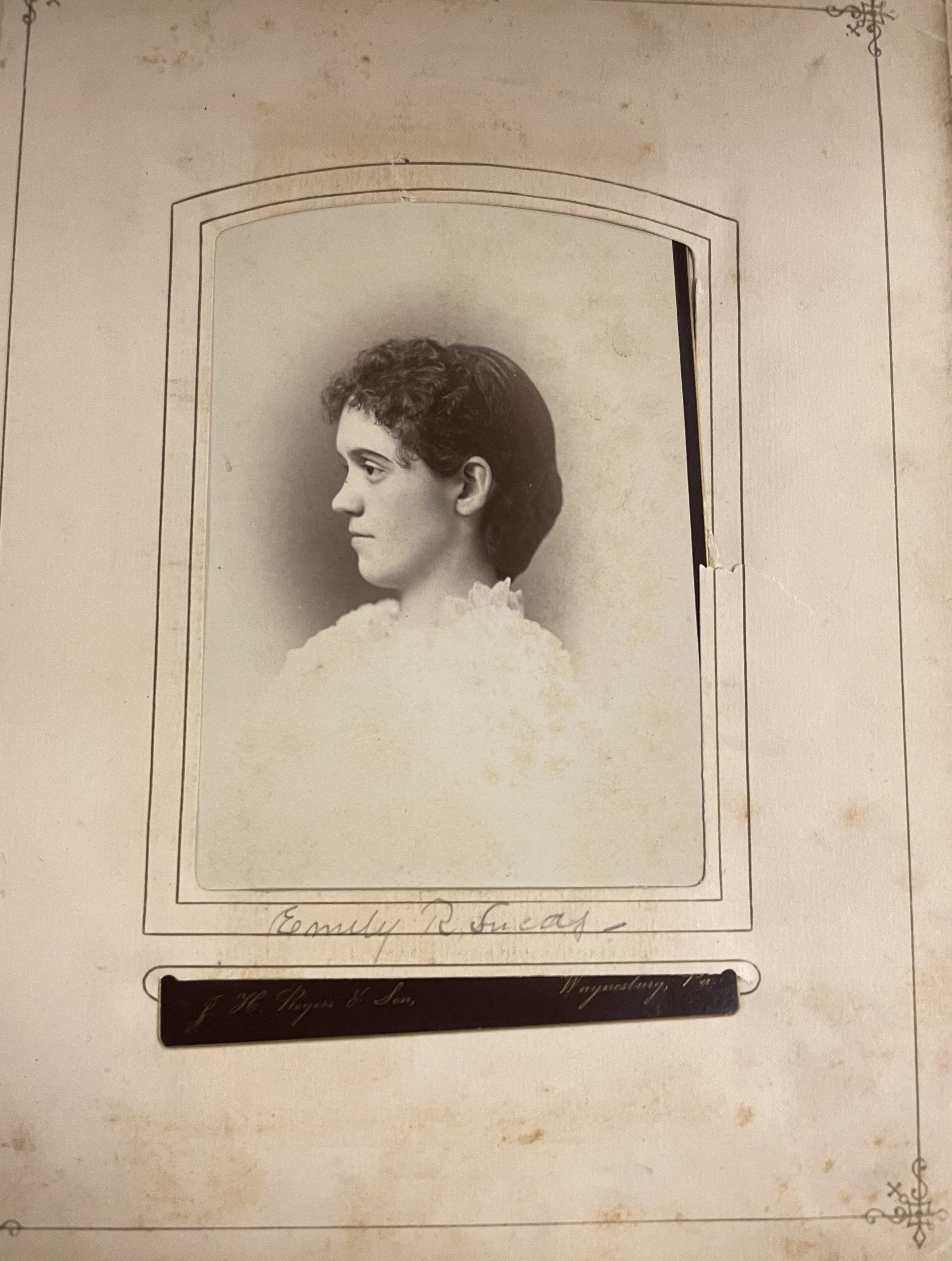 SOURCE CITATION: Phelan-Walker Album, Photo 10 - Rachel Emily "Emma" (Rinehart) Lucas [1861-1951]; circa 1880-1890, image by J. H. Rogers & Son, Waynesburg, Pa.; item no. WAYN-AN008-0010, Waynesburg University Paul R. Stewart Museum Collection, Greene Connections Archives Project (www.GreeneConnections.com).