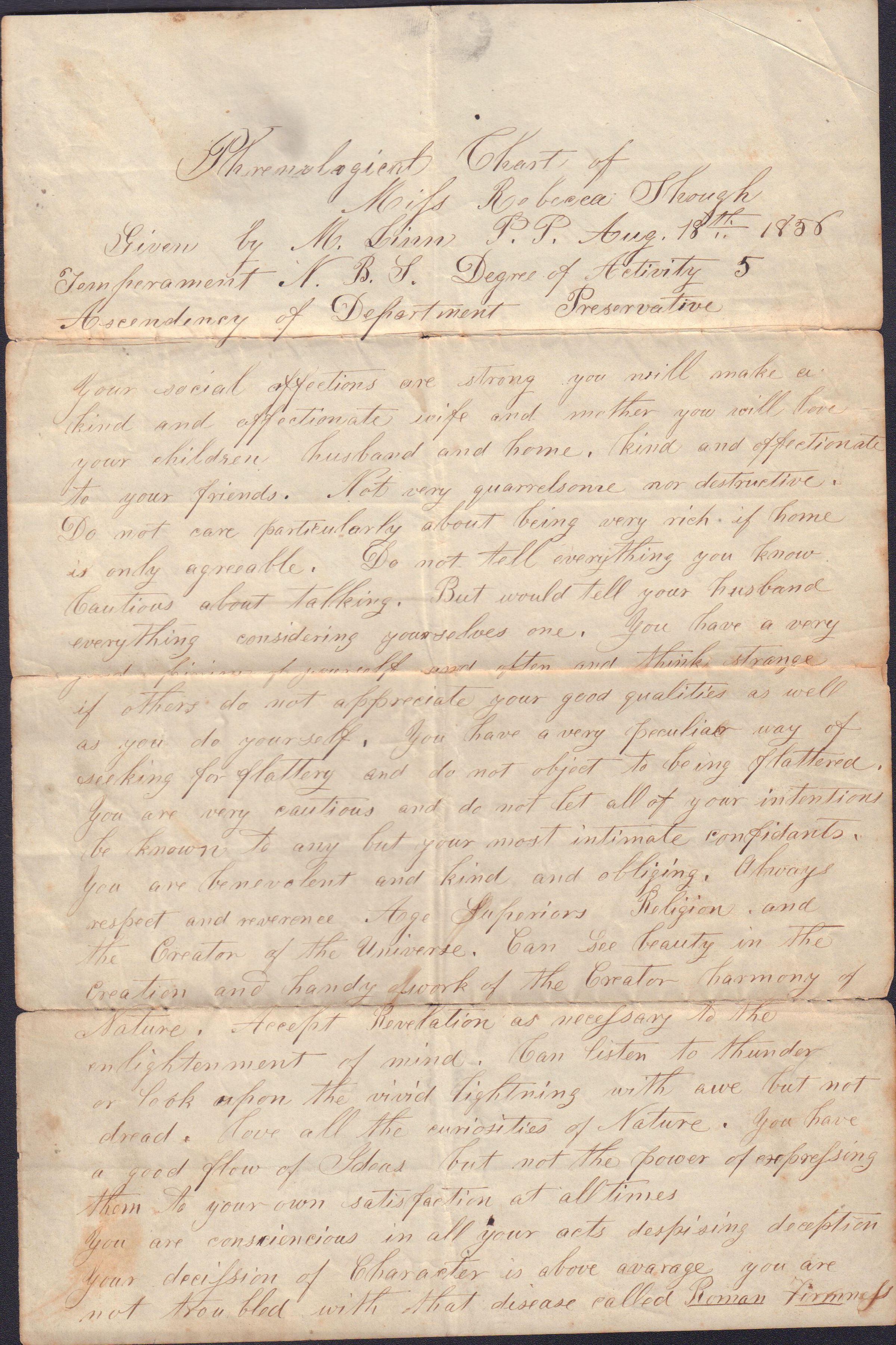 Phrenological chart of Miss Rebecca Shough, 18 August 1856, by M. Linn, P.P. [P.P. = Practical Phrenologist]. 3 pages.