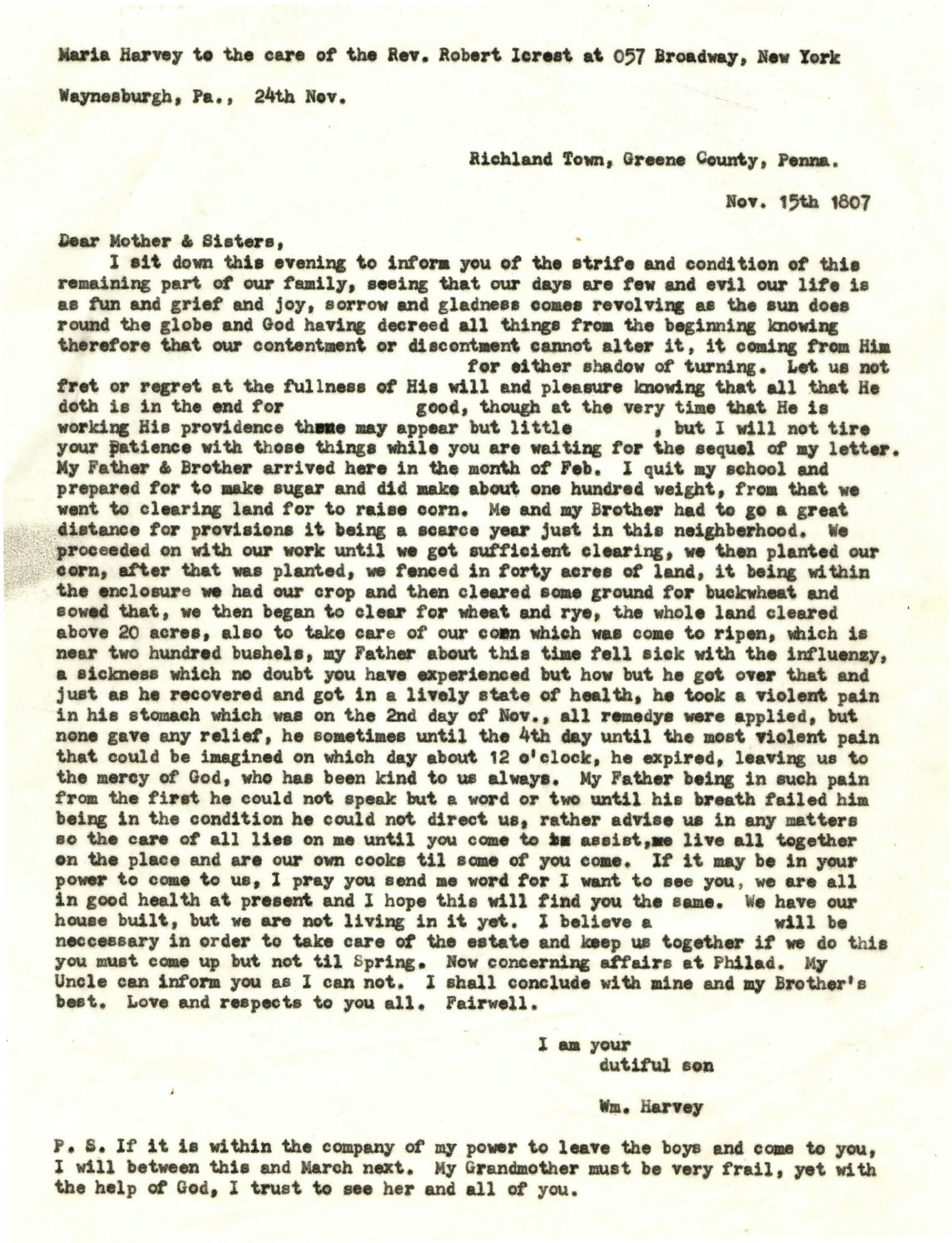 Wm. Harvey, (Richland Town, Greene County, Penna) to Maria Harvey, care of the Rev. Robert Icrest (057 Broadway, New York), letter, 15 November 1807, (postmarked 24 November 1807 Waynesburg, Pennsylvania). Transcription only. The whereabouts of the original are not known, but it is likely that aged condition caused it to be discarded and replaced by this transcription for preservation.