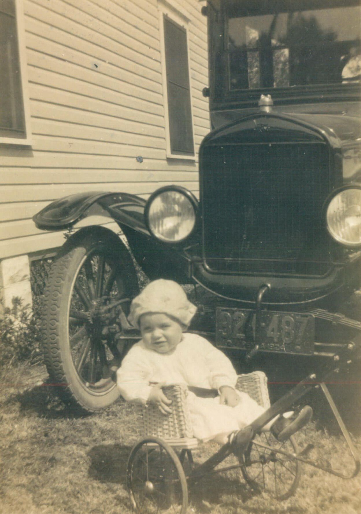 This image was identified as John Kenneth Barb [1918-1920] - son of Charles Alexander Barb Sr. and Lessie Nina Minor. However, the car bears a license plate dated 1924, which makes John too old to be the baby pictured. It is more likely that his younger brother, Harmon Miller Barb, born 1923, is actually the baby in the photo.