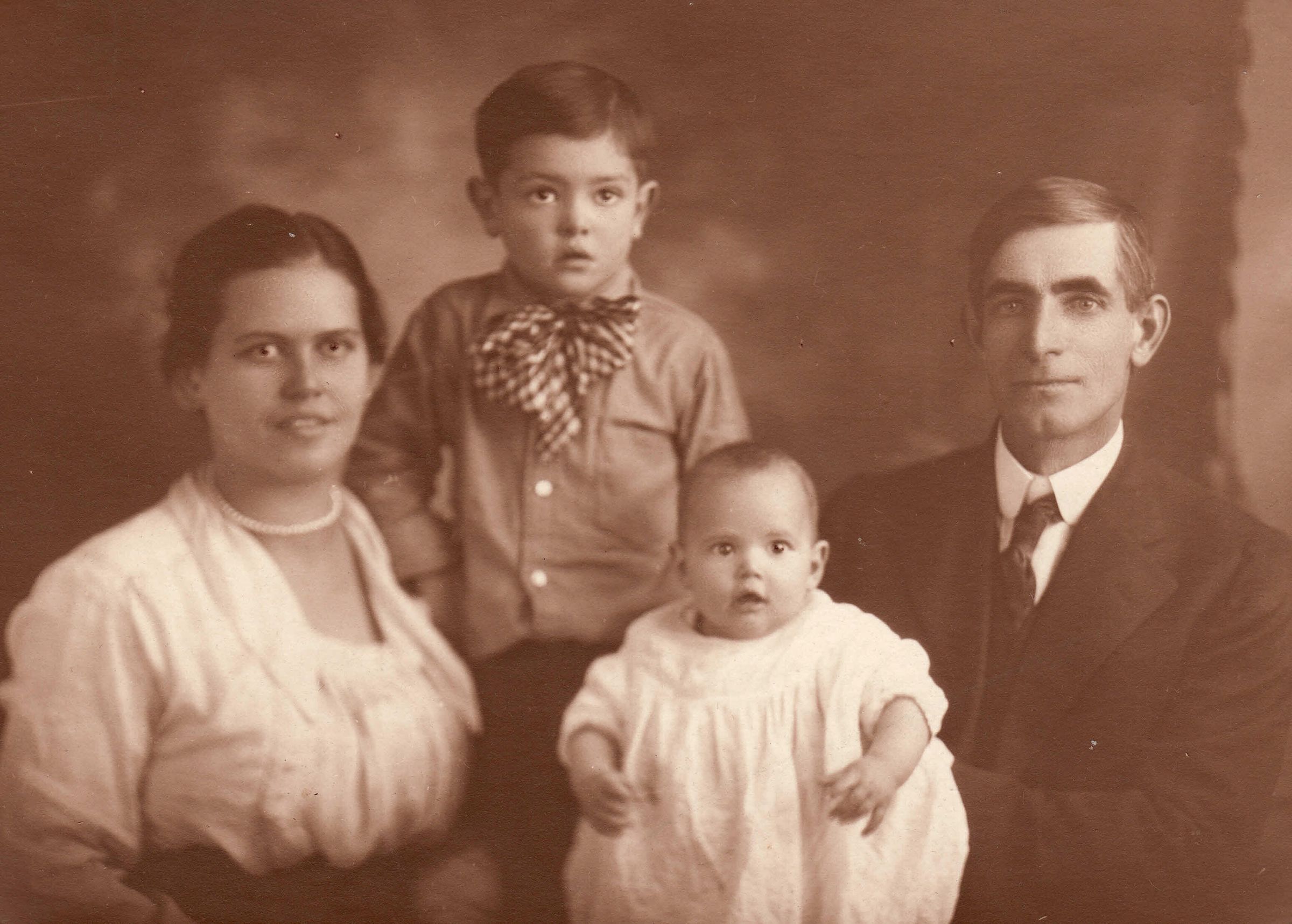 [Left-Right]: Nellie Bly (Throckmorton) (Hartzell) Ely, William Harvey Hartzell [child], Maggie Belle (Hartzell) (Rush) Conklin [baby], Garfield Arthur Hartzell.