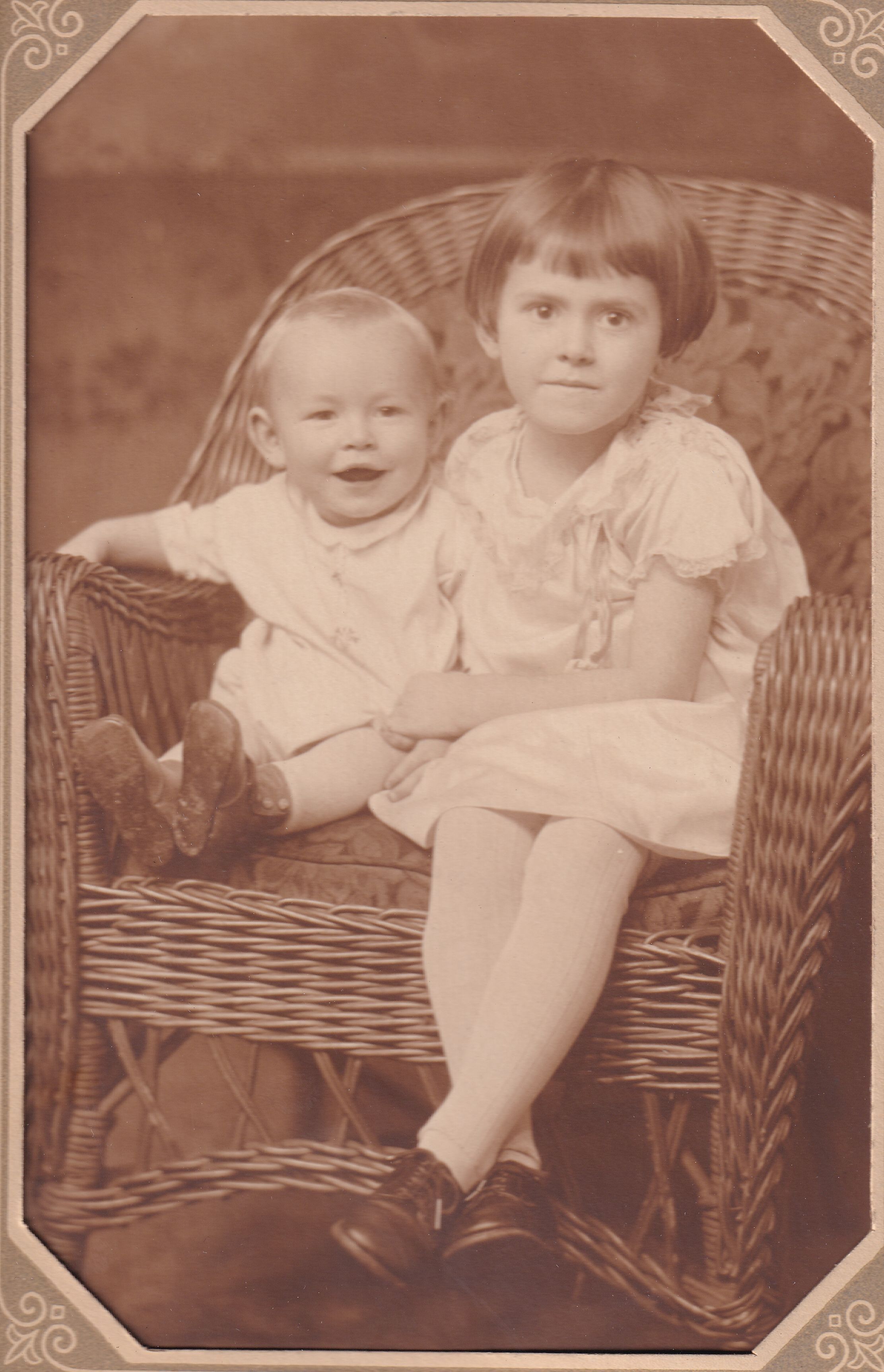 SOURCE CITATION: [Left-Right]: Wilbur Earl Davis [1926-2020] and Sara Jean Davis [1922-2011] - children of Samuel Earl Davis and Ruth Lee Springer; circa 1927-1928; item no. MORK-AN002-0030, Davis Series, Elizabeth Jane (Davis) (Rex) Morris Collection, shared by her grandchildren, John Robert Morris and Kathleen (Morris) Miller; Greene Connections Archives Project (www.GreeneConnections.com).