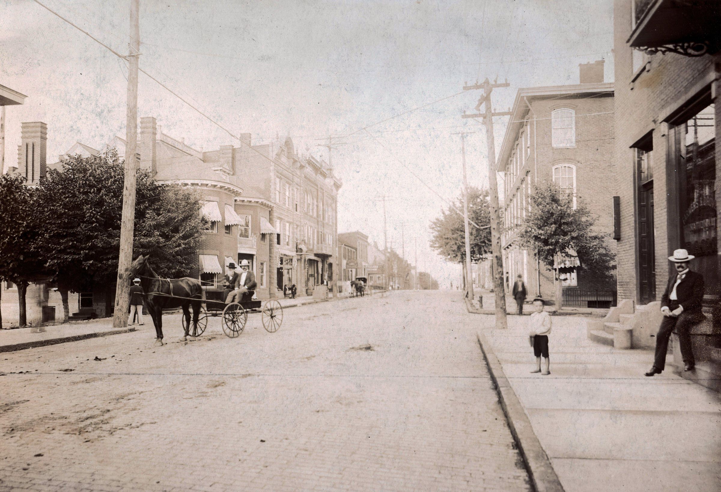 To the left side of the photo are the Dr. Rufus Edward Brock residence, Spragg & Wood building, and W. F. Blair building.