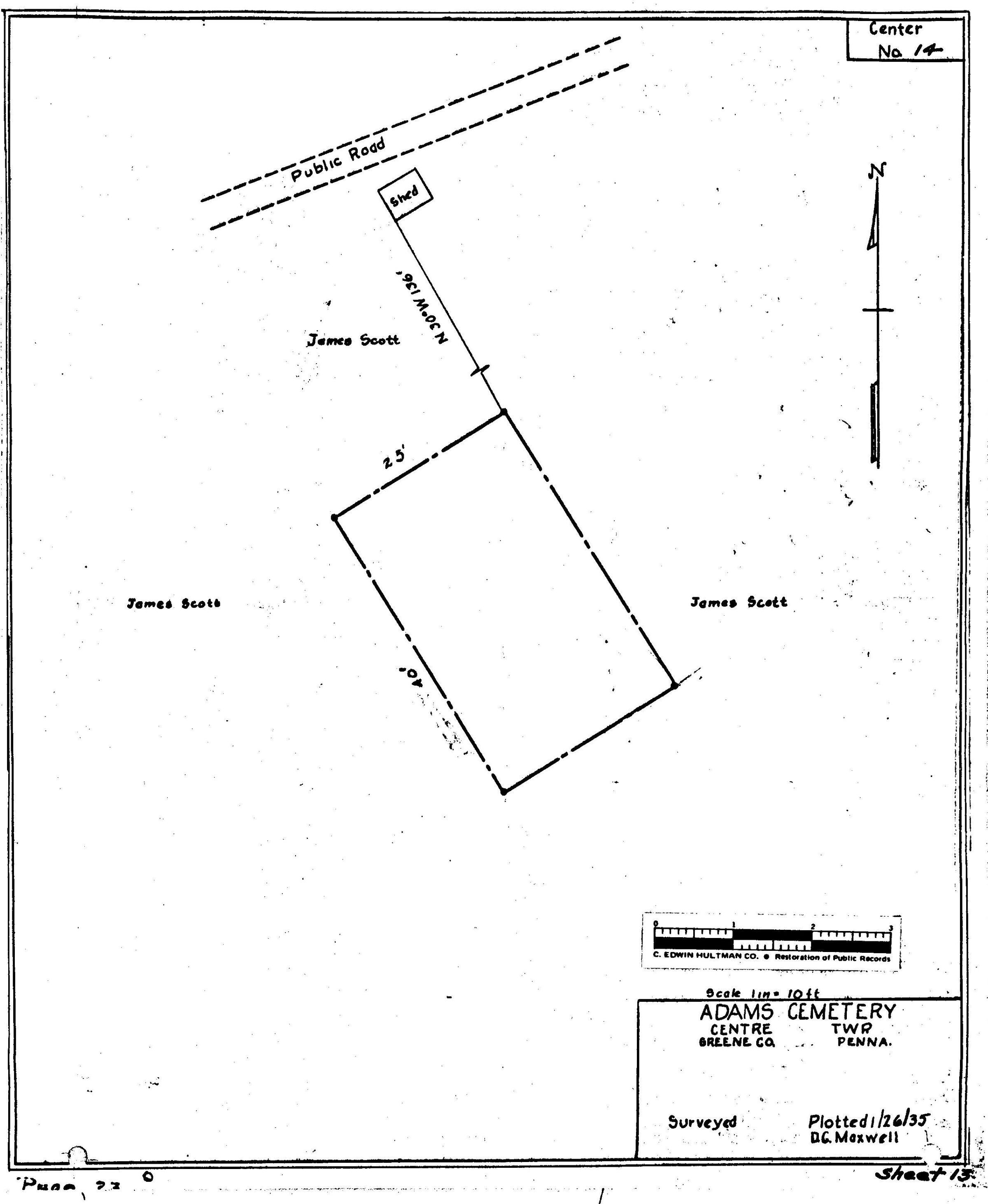 Source Citation: WPA Cemetery Plat - Pennsylvania - Greene County - Center Township - Adams Cemetery (1935), item no. 2016.3.26, Cemetery Plat (WPA) Collection, surveyed by Works Projects Administration, copy on file at the Clerk of Courts Office, Greene County Courthouse, Greene Connections Archives Project (GreeneConnections.com).