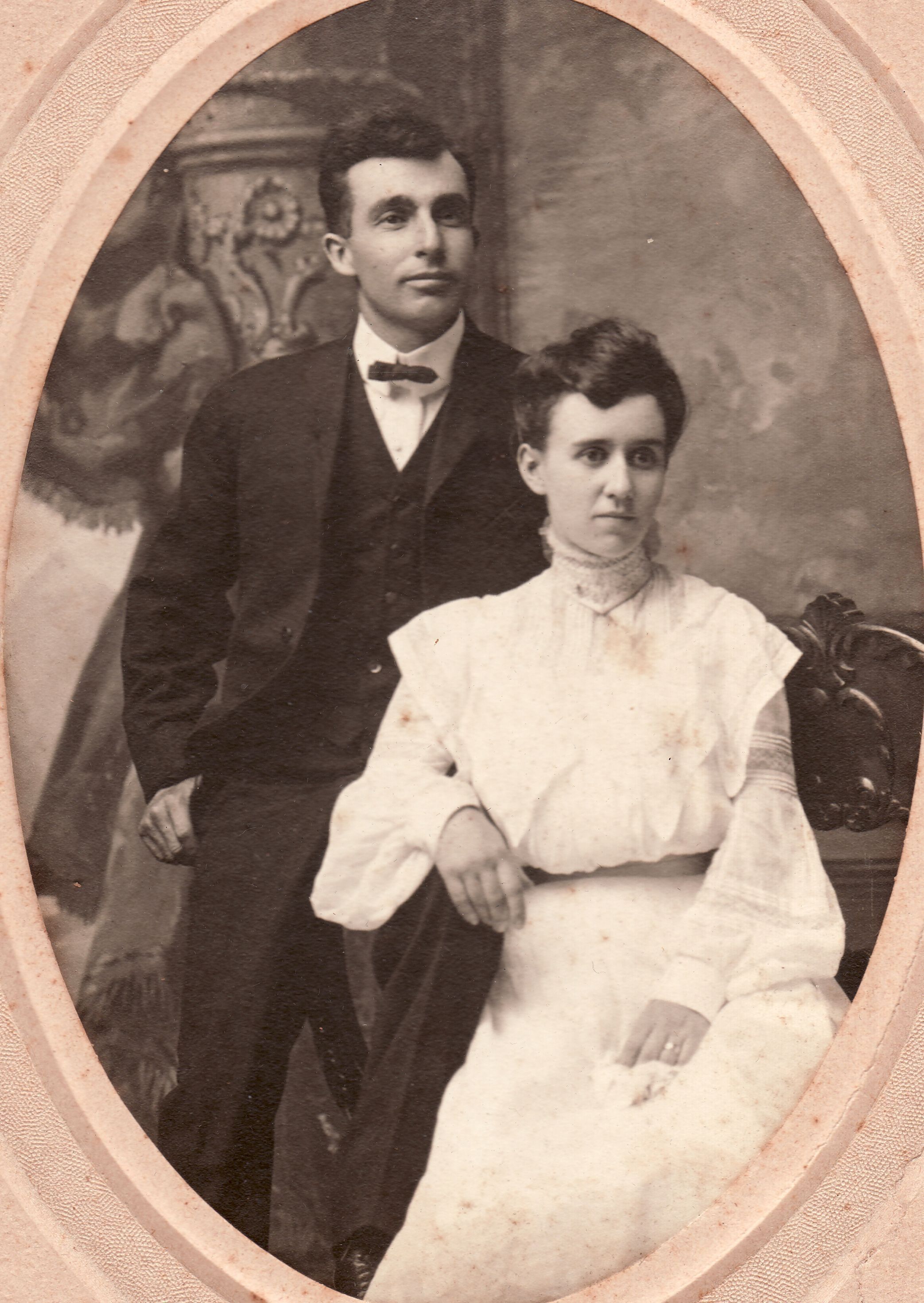 SOURCE CITATION: Albert Beam [1873-1964] and his wife, Martha (Scott) Beam [1878-1960]; circa 1905, image by Canky, Xenia, O.; item no. CARP-AN004-0018, Sellers Burdette and Bettie (Blake) Carpenter Collection, shared by their heirs; Greene Connections Archives Project (GreeneConnections.com).